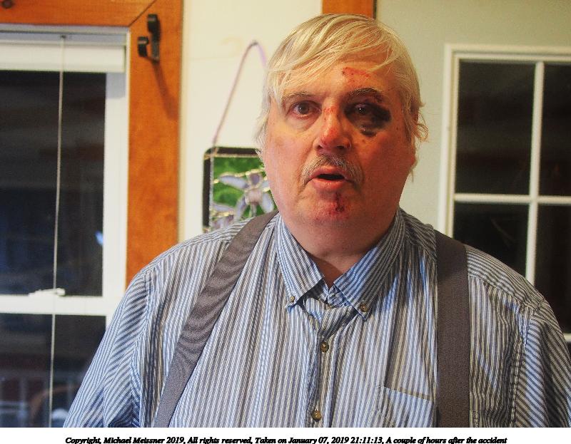 The picture of me is several hours later after I did some cleanup. The emergency room nurse said that the bruise will eventually go lower in the face before going away.