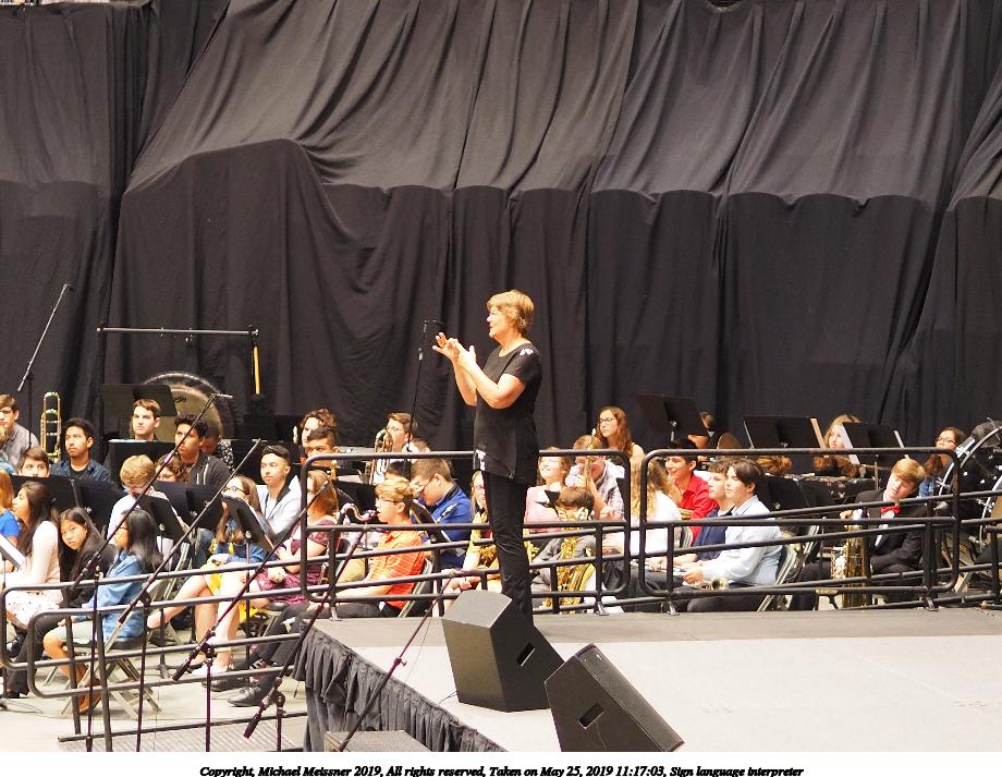 Picture #6: Sign language interpreter 920x713, 141,793 bytes (139K), (html file) Copyright, Michael Meissner 2019, All rights reserved Olympus E-M1-I camera with Olympus-m43 45mm f/1.8 lens f/1.8, ISO 1000, 1/100 sec, 45.0mm, auto mode, vivid color, SHQ, matrix metering, bias -0.3, digital zoom x2, IS Auto, noise filter low, anti-shock 35mm equivalent focal length 180.0mm, digital zoom x2 Programs used: crop, raw therapee Taken by Michael Meissner on May 25, 2019 11:17:03 Last modified on December 25, 2019 at 19:11 |