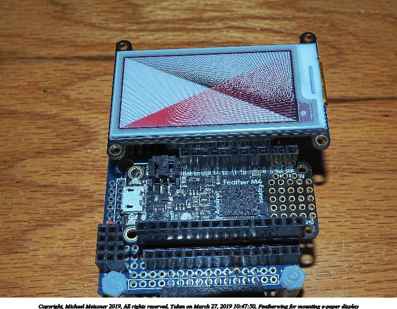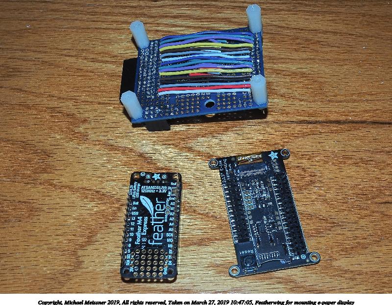 Picture #5: Featherwing for mounting e-paper display 800x623, 162,767 bytes (159K), (html file) Copyright, Michael Meissner 2019, All rights reserved Olympus E-M10-II camera with Panasonic-Leica 15mm f/1.7 lens f/8.0, ISO 200, flash (-0.33 flash compensation), 1/60 sec, 15.0mm, aperture priority, vivid color, auto gradation, SHQ, matrix metering, IS Auto, noise reduction auto 35mm equivalent focal length 30.0mm Taken by Michael Meissner on March 27, 2019 10:46:36 Last modified on March 27, 2019 at 11:10 |