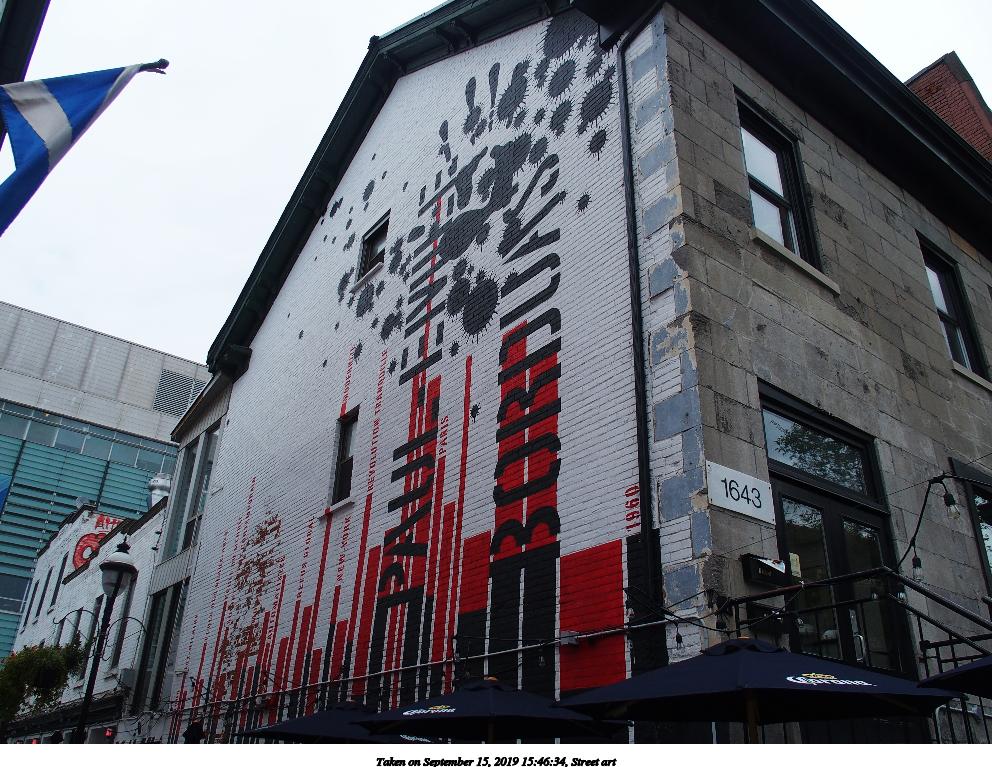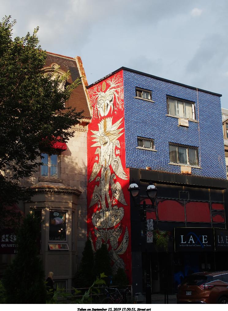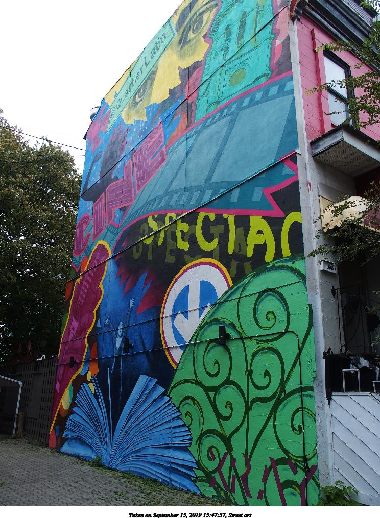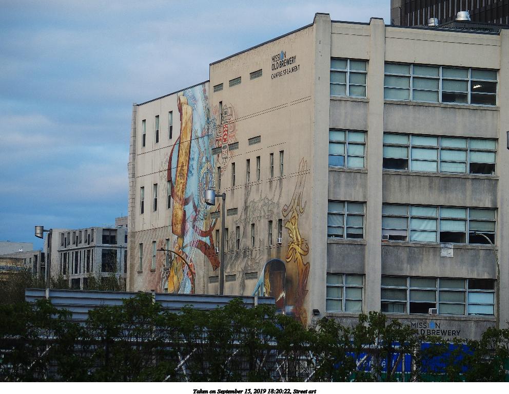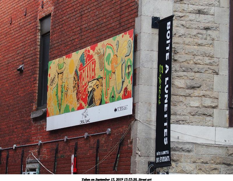 Picture #14: Street art #6 992x767, 190,775 bytes (187K), (html file) Olympus Stylus-1 camera f/3.5, ISO 100, 1/125 sec, 6.0mm, auto mode, vivid color, SHQ, matrix metering, IS Auto, noise reduction auto, noise filter low 35mm equivalent focal length 28.0mm Programs used: raw therapee Taken by Michael Meissner on September 15, 2019 15:54:46 Last modified on December 04, 2019 at 09:25 |