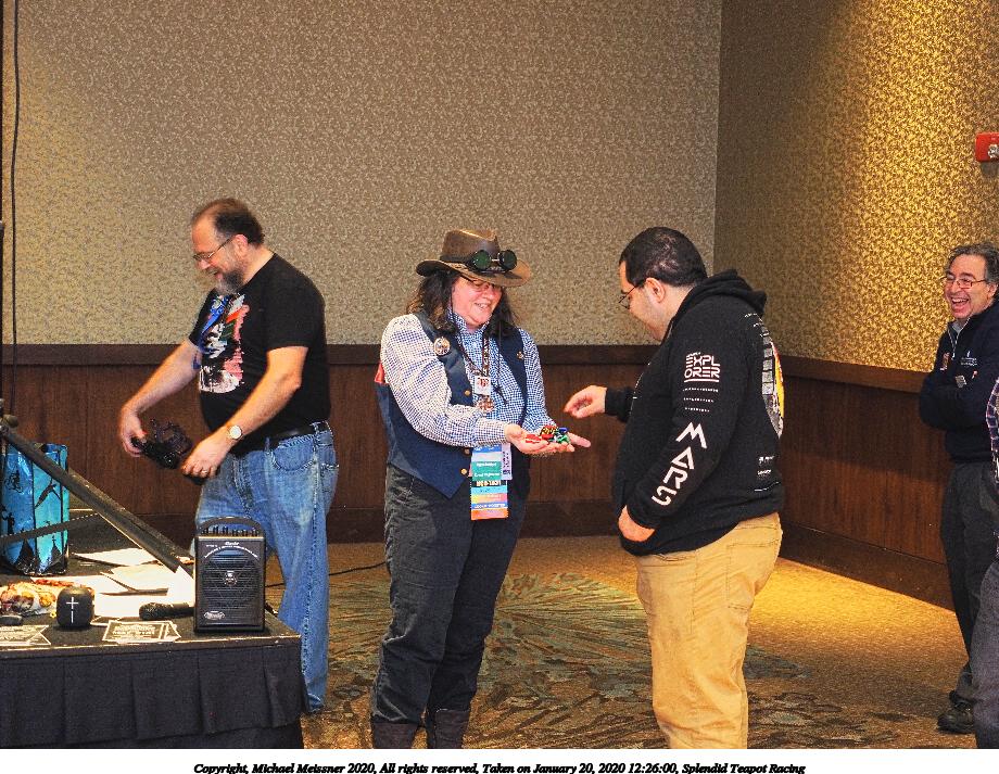 Picture #59: Splendid Teapot Racing #2 Small: 1000x690, 147,231 bytes (144K), (html file) Large: 3000x2000, 4,753,810 bytes (4.5M), (html file) Copyright, Michael Meissner 2020, All rights reserved Olympus E-M1-I camera with Olympus-m43 12-40mm f/2.8 lens f/2.8, ISO 200, FL-900R flash (+0.33 flash compensation), 1/60 sec, 26.0mm, auto mode, vivid color, SHQ, center weight metering, IS Auto, noise filter low, anti-shock 35mm equivalent focal length 52.0mm Programs used: crop, gimp, raw therapee Taken by Michael Meissner on January 20, 2020 11:39:05 Last modified on June 12, 2020 at 20:18 |
