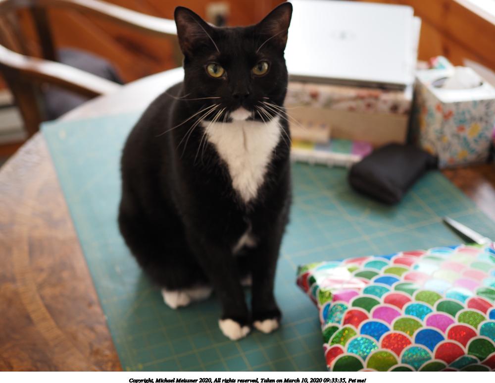 Picture #7: Pet me! 1000x773, 89,739 bytes (88K), (html file) Copyright, Michael Meissner 2020, All rights reserved Olympus E-M5-III camera with Olympus-m43 25mm f/1.8 lens f/1.8, ISO 250, 1/60 sec, 25.0mm, auto mode, natural color, matrix metering, IS Auto, noise reduction auto, both eyes priority, face detection 35mm equivalent focal length 50.0mm Programs used: crop, raw therapee Taken by Michael Meissner on March 10, 2020 09:33:35 Last modified on March 10, 2020 at 11:46 This picture is one of my favorites. |