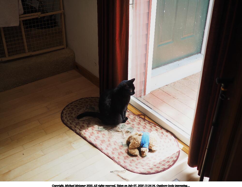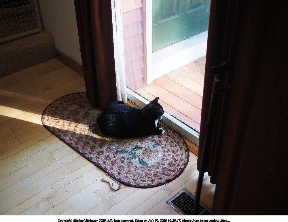 Picture #10: Maybe I can be an outdoor kitty.... 1000x773, 110,632 bytes (109K), (html file) Copyright, Michael Meissner 2020, All rights reserved Olympus E-M5-III camera with Panasonic 20mm f/1.7 lens f/2.0, ISO 200, 1/80 sec, 20.0mm, auto mode, vivid color, SHQ, matrix metering, IS Auto, noise reduction auto 35mm equivalent focal length 40.0mm Programs used: crop, raw therapee Taken by Michael Meissner on July 06, 2020 16:20:17 Last modified on August 14, 2020 at 00:49 |