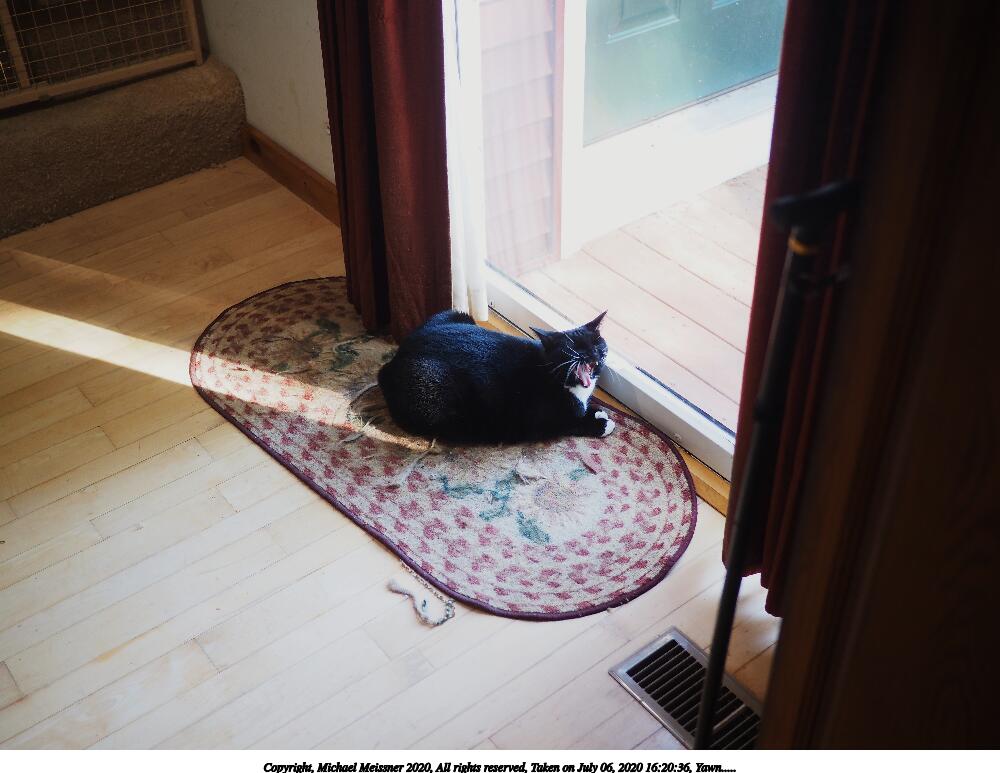 Picture #9: Yawn..... 1000x773, 105,539 bytes (104K), (html file) Copyright, Michael Meissner 2020, All rights reserved Olympus E-M5-III camera with Panasonic 20mm f/1.7 lens f/1.8, ISO 320, 1/60 sec, 20.0mm, auto mode, vivid color, SHQ, spot metering, IS Auto, noise reduction auto 35mm equivalent focal length 40.0mm Programs used: crop, raw therapee Taken by Michael Meissner on July 06, 2020 16:20:36 Last modified on August 14, 2020 at 00:49 |