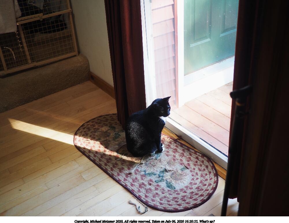 Picture #8: What's up? 1000x773, 116,225 bytes (114K), (html file) Copyright, Michael Meissner 2020, All rights reserved Olympus E-M5-III camera with Panasonic 20mm f/1.7 lens f/1.8, ISO 200, 1/60 sec, 20.0mm, auto mode, vivid color, SHQ, center weight metering, IS Auto, noise reduction auto 35mm equivalent focal length 40.0mm Programs used: crop, raw therapee Taken by Michael Meissner on July 06, 2020 16:20:55 Last modified on August 14, 2020 at 00:50 |
