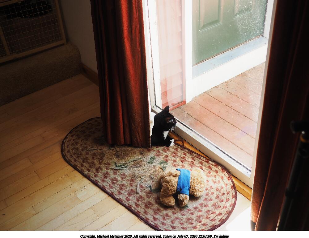 Picture #6: I'm hiding 1000x773, 127,297 bytes (125K), (html file) Copyright, Michael Meissner 2020, All rights reserved Olympus E-M5-III camera with Panasonic 20mm f/1.7 lens f/2.2, ISO 200, 1/125 sec, 20.0mm, auto mode, vivid color, SHQ, center weight metering, IS Auto, noise reduction auto 35mm equivalent focal length 40.0mm Programs used: crop, raw therapee Taken by Michael Meissner on July 07, 2020 12:01:09 Last modified on August 14, 2020 at 00:50 |