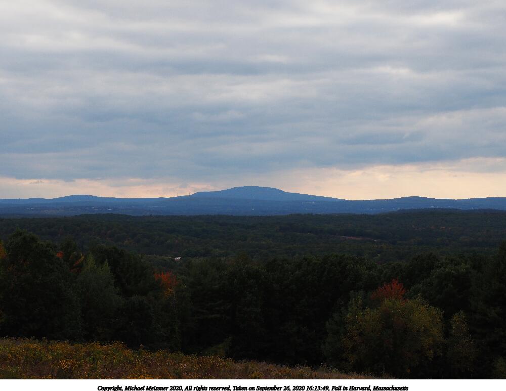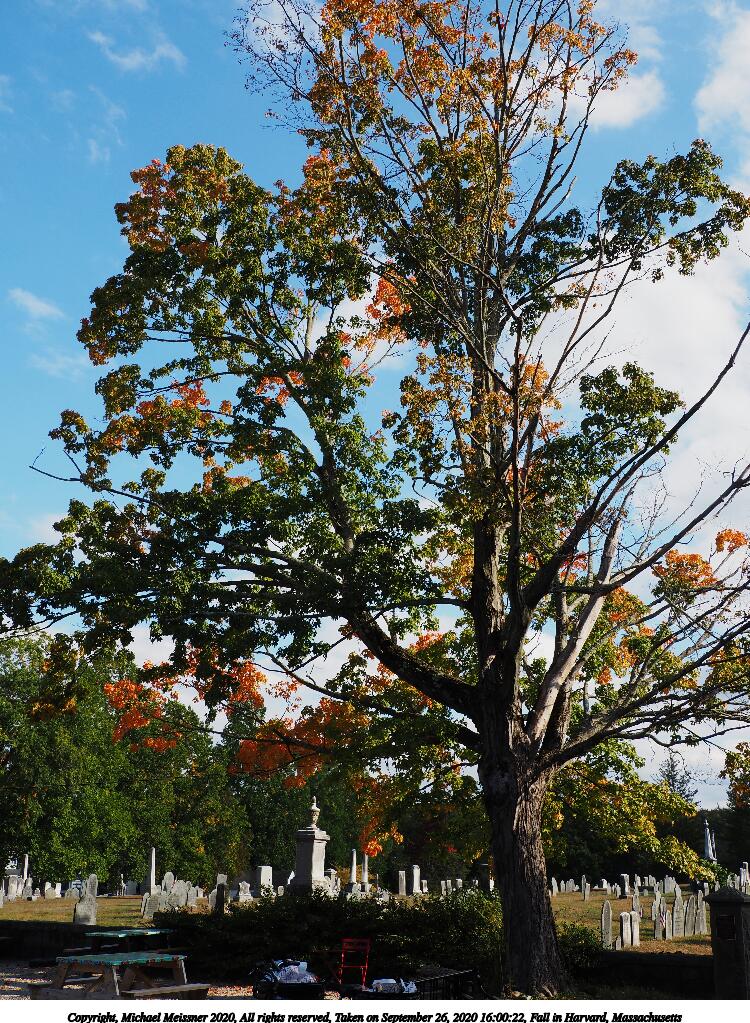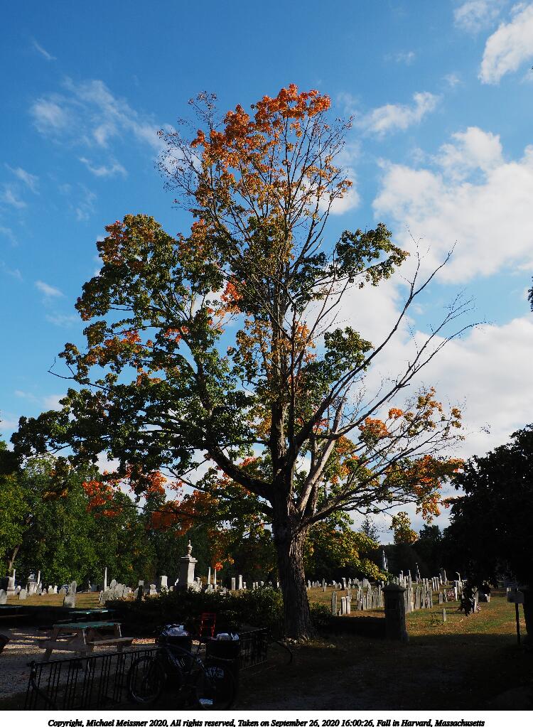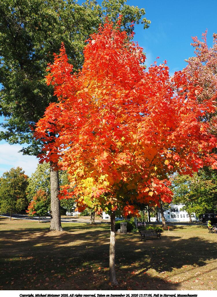 Picture #6: Fall in Harvard, Massachusetts #5 1000x773, 82,569 bytes (81K), (html file) Copyright, Michael Meissner 2020, All rights reserved Olympus E-M5-III camera with Olympus-m43 12-200mm f/3.5-6.3 lens f/9.0, ISO 200, 1/250 sec, 45.0mm, auto mode, vivid color, SHQ, spot metering, IS Auto 35mm equivalent focal length 90.0mm Programs used: crop, raw therapee Taken by Michael Meissner on September 26, 2020 16:13:49 Last modified on December 07, 2020 at 18:59 |