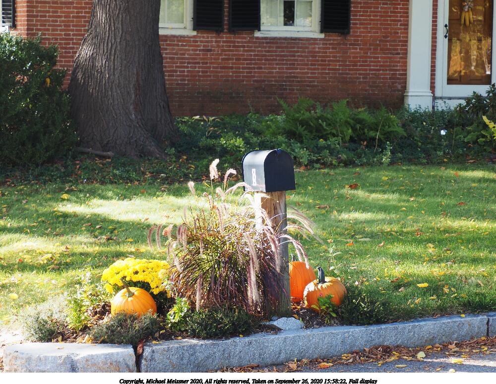 Picture #2: Fall display 1000x773, 231,353 bytes (226K), (html file) Copyright, Michael Meissner 2020, All rights reserved Olympus E-M5-III camera with Olympus-m43 12-200mm f/3.5-6.3 lens f/5.8, ISO 250, 1/100 sec, 56.0mm, auto mode, vivid color, SHQ, matrix metering, IS Auto 35mm equivalent focal length 112.0mm Programs used: crop, raw therapee Taken by Michael Meissner on September 26, 2020 15:58:22 Last modified on December 07, 2020 at 18:56 |