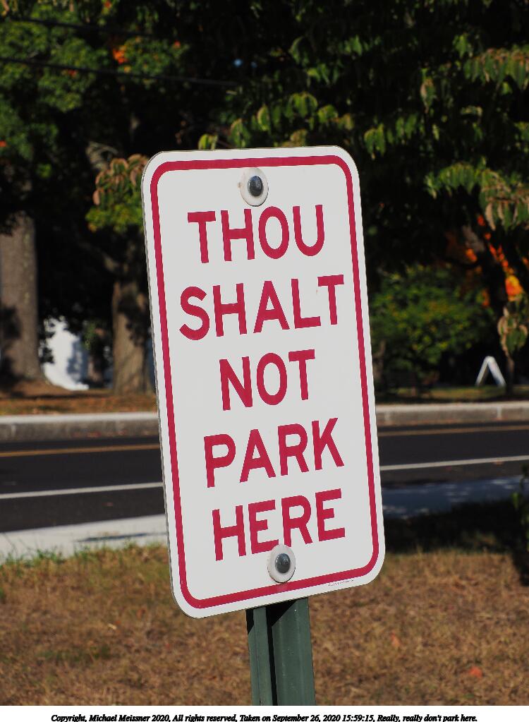Picture #1: Really, really don't park here. 750x1023, 122,487 bytes (120K), (html file) Copyright, Michael Meissner 2020, All rights reserved Olympus E-M5-III camera with Olympus-m43 12-200mm f/3.5-6.3 lens f/11.0, ISO 200, 1/500 sec, 63.0mm, auto mode, vivid color, SHQ, matrix metering, IS Auto 35mm equivalent focal length 126.0mm Programs used: crop, raw therapee, rotate left Taken by Michael Meissner on September 26, 2020 15:59:15 Last modified on December 07, 2020 at 18:57 |