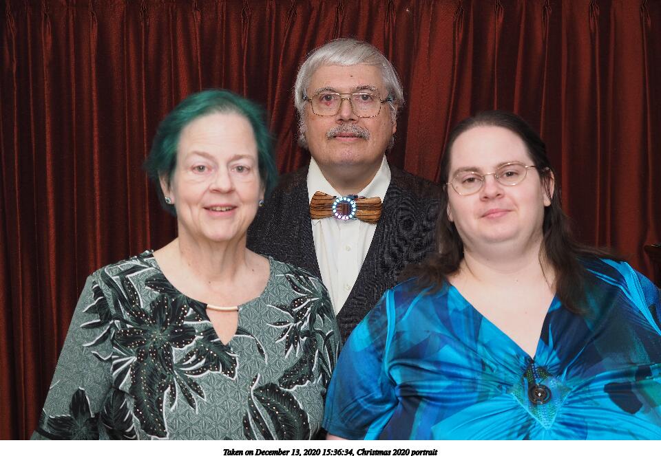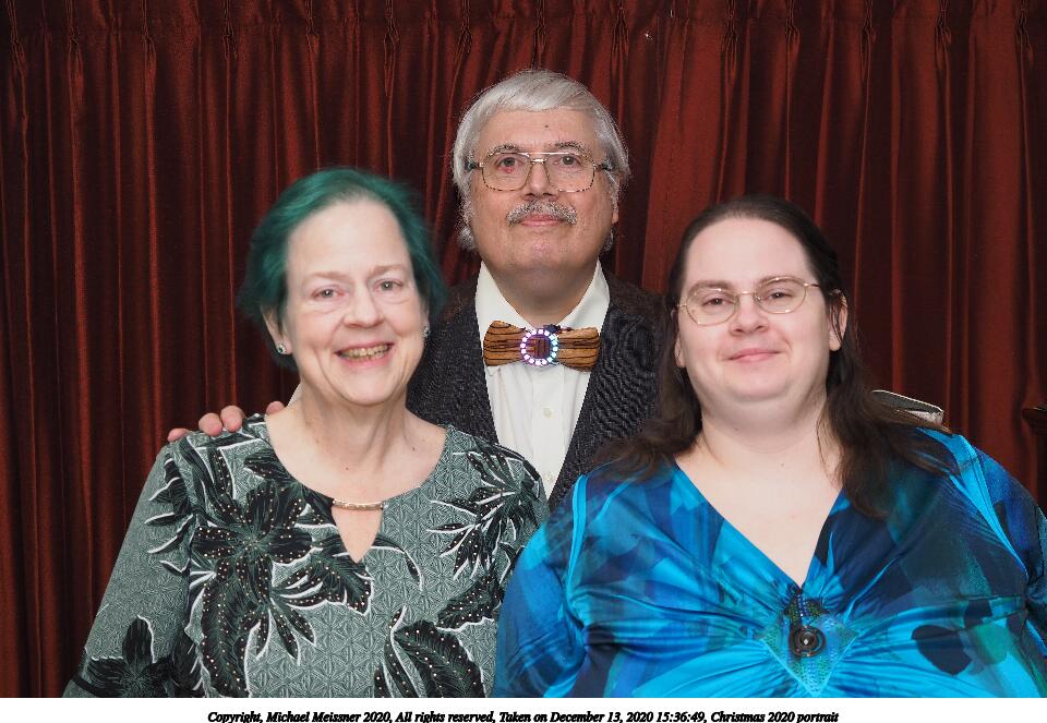 Picture #34: Christmas 2020 portrait #2 960x663, 129,010 bytes (126K), (html file) Copyright, Michael Meissner 2020, All rights reserved Olympus E-M5-III camera with Olympus-m43 12-40mm f/2.8 lens f/2.8, ISO 200, FL-900R flash, 1/60 sec, 30.0mm, auto mode, vivid color, SHQ, matrix metering, IS Auto, noise reduction auto 35mm equivalent focal length 60.0mm Programs used: crop, gimp Taken by Michael Meissner on December 13, 2020 15:36:49 Last modified on December 13, 2020 at 16:27 |