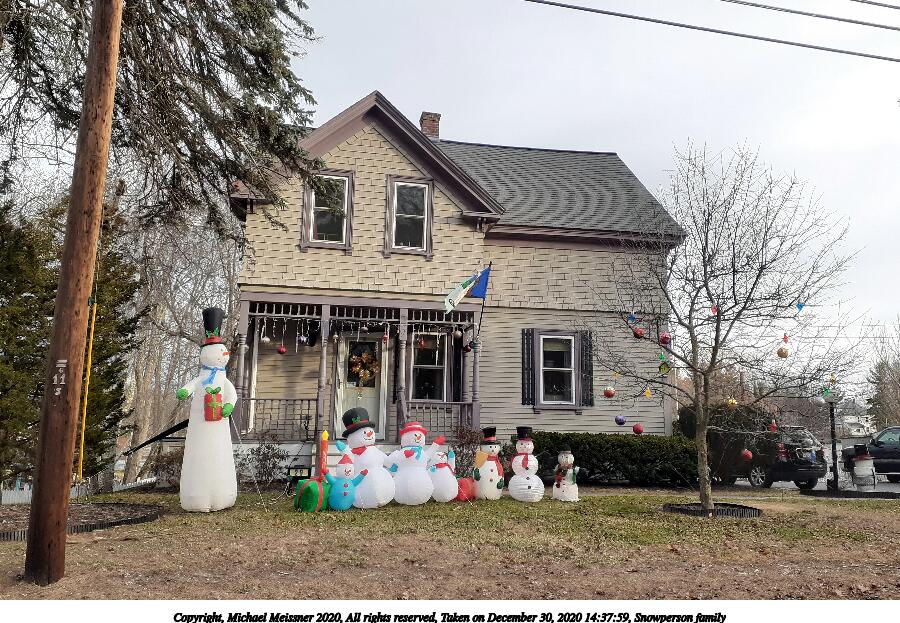 Picture #1: Snowperson family 900x623, 181,097 bytes (177K), (html file) Copyright, Michael Meissner 2020, All rights reserved Samsung A20 phone f/1.9, ISO 40, 1/265 sec, 3.6mm, auto mode, spot metering 35mm equivalent focal length 27.0mm Programs used: gimp Taken by Michael Meissner on December 30, 2020 14:37:59 Last modified on December 30, 2020 at 23:20 |