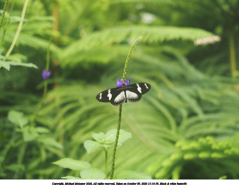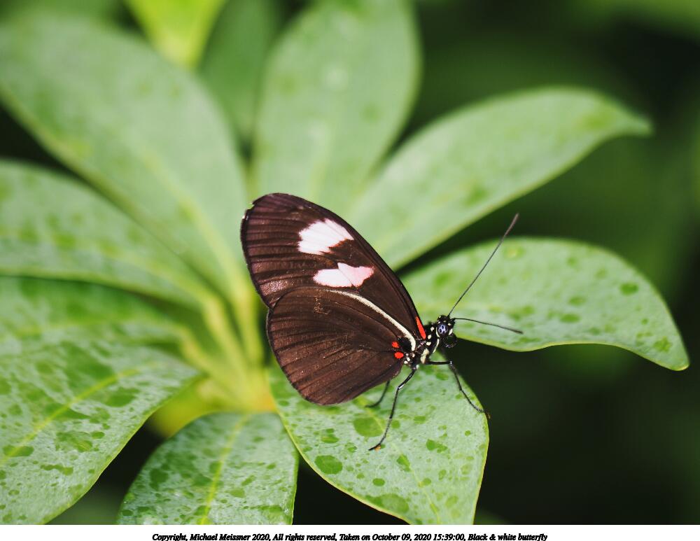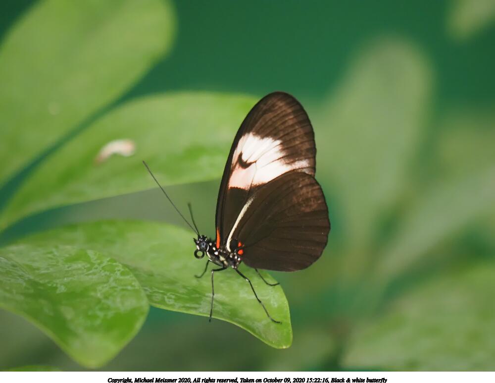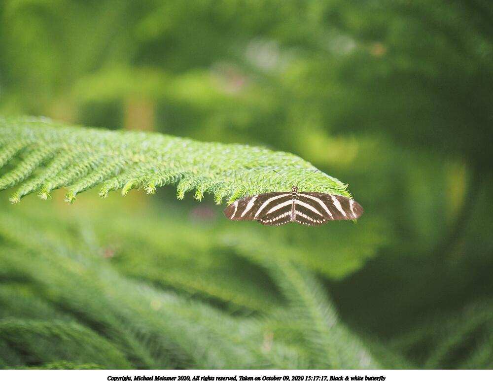 Picture #28: Black & white butterfly #5 1000x773, 92,163 bytes (91K), (html file) Copyright, Michael Meissner 2020, All rights reserved Olympus E-M5-III camera with Olympus 50-200mm lens f/3.4, ISO 200, flash, 1/60 sec, 182.0mm, auto mode, vivid color, SHQ, matrix metering, IS Auto 35mm equivalent focal length 365.0mm Programs used: crop, raw therapee Taken by Michael Meissner on October 09, 2020 15:39:00 Last modified on January 01, 2021 at 00:30 |