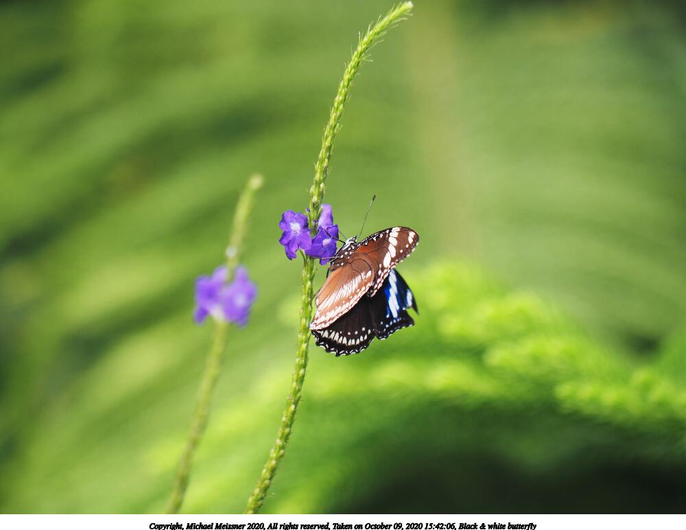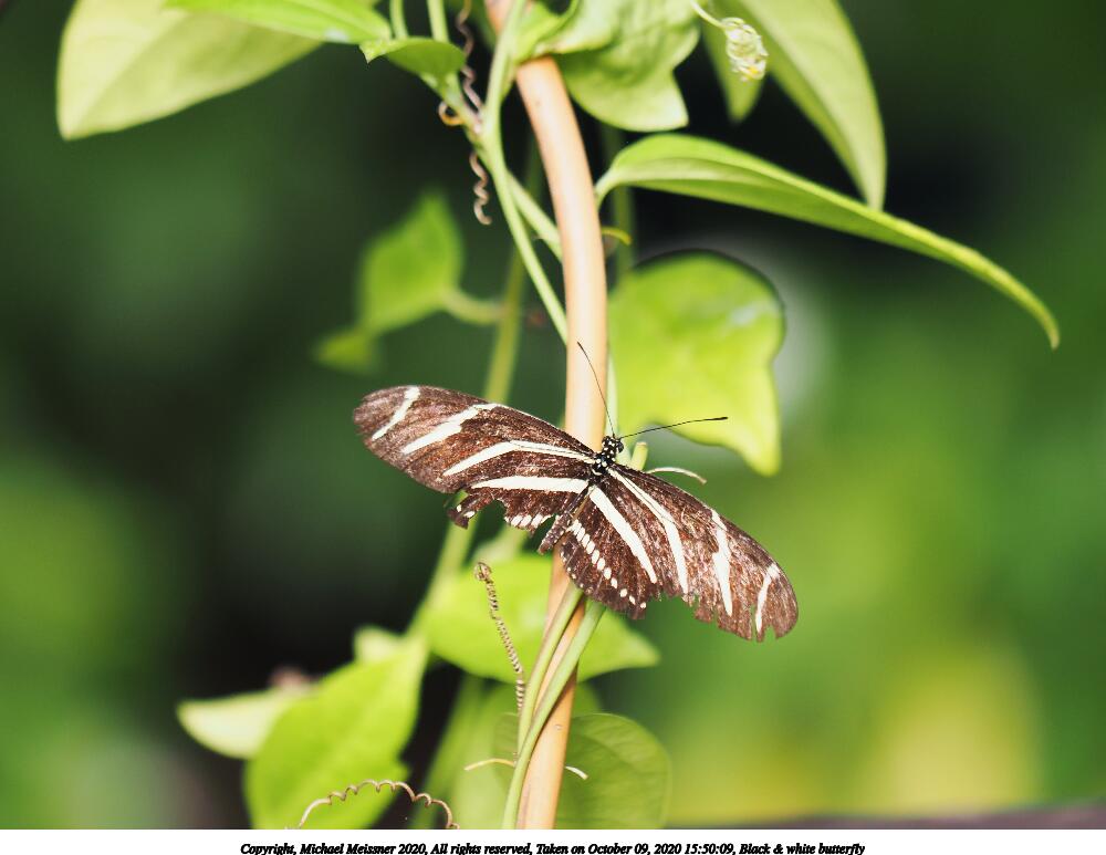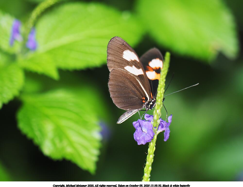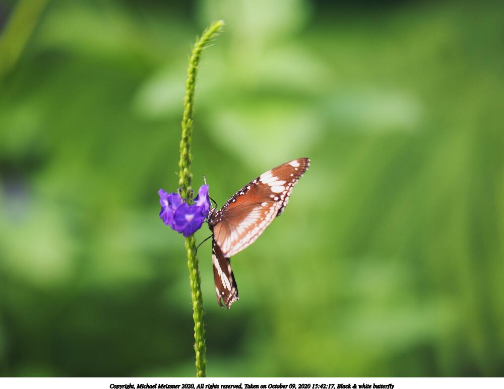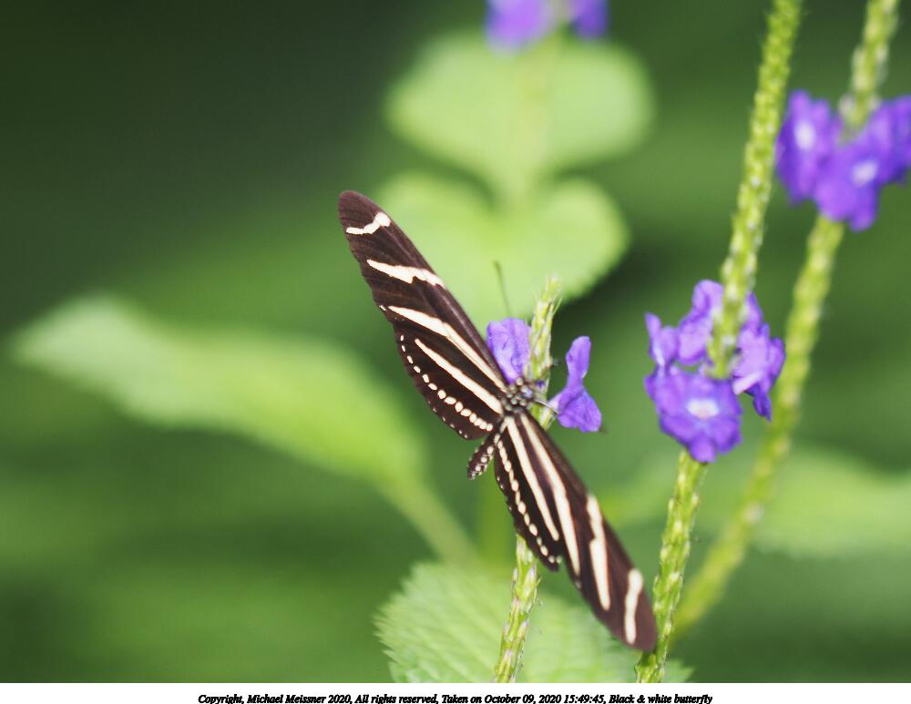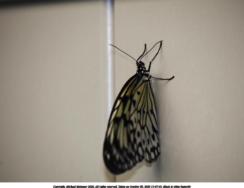 Picture #35: Black & white butterfly #8 1000x773, 62,331 bytes (61K), (html file) Copyright, Michael Meissner 2020, All rights reserved Olympus E-M5-III camera with Olympus 50-200mm lens f/3.1, ISO 200, flash, 1/160 sec, 137.0mm, auto mode, vivid color, SHQ, matrix metering, IS Auto 35mm equivalent focal length 274.0mm Programs used: crop, raw therapee Taken by Michael Meissner on October 09, 2020 15:47:43 Last modified on January 01, 2021 at 00:32 |