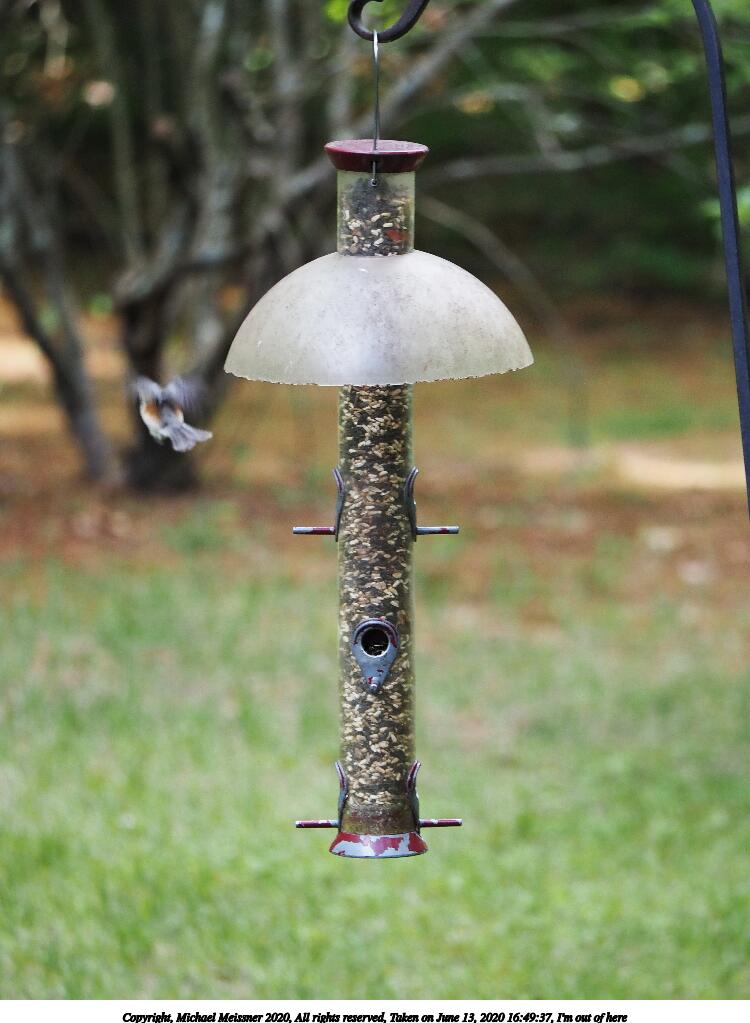 Picture #2: I'm out of here 750x1023, 98,789 bytes (97K), (html file) Copyright, Michael Meissner 2020, All rights reserved Olympus E-M5-III camera with Panasonic 100-300mm-II lens f/4.5, ISO 1000, 1/320 sec, 150.0mm, auto mode, natural color, matrix metering, IS1 (All Direction Shake IS), noise reduction auto 35mm equivalent focal length 301.0mm Programs used: crop, raw therapee, rotate left Taken by Michael Meissner on June 13, 2020 16:49:37 Last modified on October 17, 2020 at 23:21 |