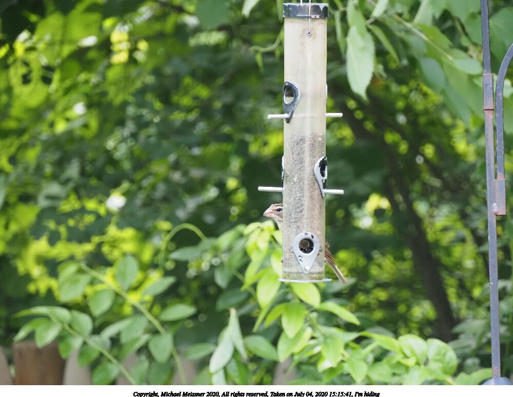 Picture #40: I'm hiding 1000x773, 113,620 bytes (111K), (html file) Copyright, Michael Meissner 2020, All rights reserved Olympus E-M5-III camera with Olympus-m43 12-200mm f/3.5-6.3 lens f/6.3, ISO 4000, 1/400 sec, 200.0mm, auto mode, vivid color, SHQ, matrix metering, IS Auto, noise reduction auto 35mm equivalent focal length 401.0mm Programs used: crop, raw therapee Taken by Michael Meissner on July 04, 2020 15:15:41 Last modified on January 02, 2021 at 00:28 |