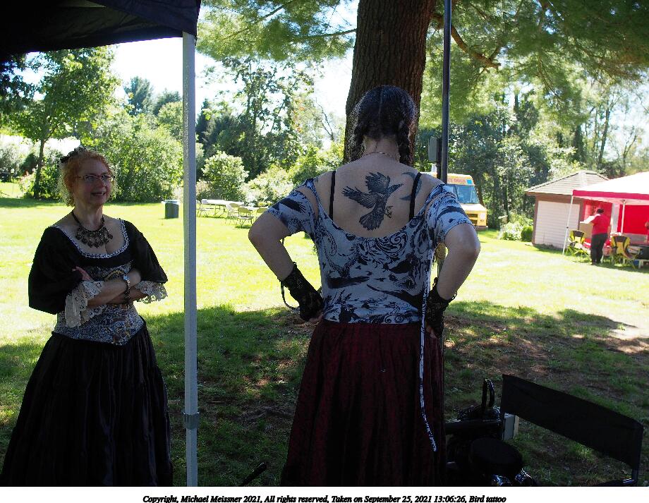 Picture #9: Bird tattoo Small: 920x713, 177,867 bytes (174K), (html file) Large: 4600x3450, 10,837,809 bytes (11M), (html file) Copyright, Michael Meissner 2021, All rights reserved Olympus E-M5-I camera with Sigma 16mm f/1.4 lens f/3.2, ISO 200, 1/400 sec, 16.0mm, auto mode, vivid color, SHQ, matrix metering, IS1 (All Direction Shake IS), noise reduction auto, noise filter low 35mm equivalent focal length 32.0mm Programs used: crop, gimp, raw therapee Taken by Michael Meissner on September 25, 2021 13:06:26 Last modified on December 12, 2021 at 15:20 |