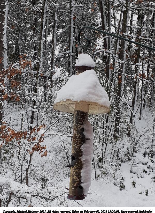 Picture #22: Snow covered bird feeder 600x823, 195,408 bytes (191K), (html file) Copyright, Michael Meissner 2021, All rights reserved Samsung A20 phone f/1.9, ISO 40, 1/210 sec, 3.6mm, auto mode, spot metering 35mm equivalent focal length 27.0mm Programs used: raw therapee, rotate right Taken by Michael Meissner on February 02, 2021 15:20:08 Last modified on February 02, 2021 at 19:26 |