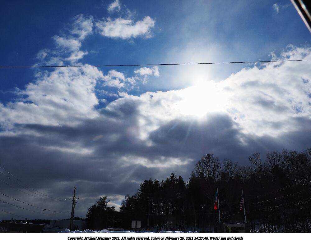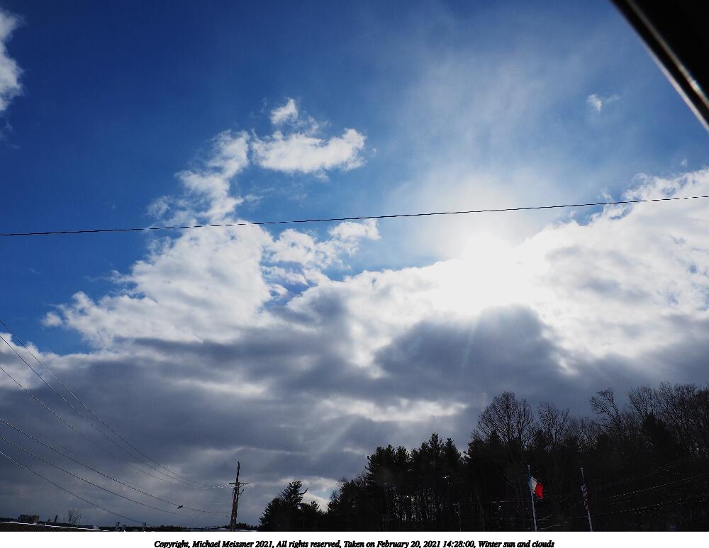 Picture #10: Winter sun and clouds 1000x773, 95,352 bytes (94K), (html file) Copyright, Michael Meissner 2021, All rights reserved Olympus E-M5-III camera with Olympus-m43 12-200mm f/3.5-6.3 lens f/11.0, ISO 200, 1/1250 sec, 14.0mm, auto mode, vivid color, Spot+Highlight control, IS Auto 35mm equivalent focal length 28.0mm Programs used: crop, raw therapee Taken by Michael Meissner on February 20, 2021 14:27:48 Last modified on February 20, 2021 at 19:22 |