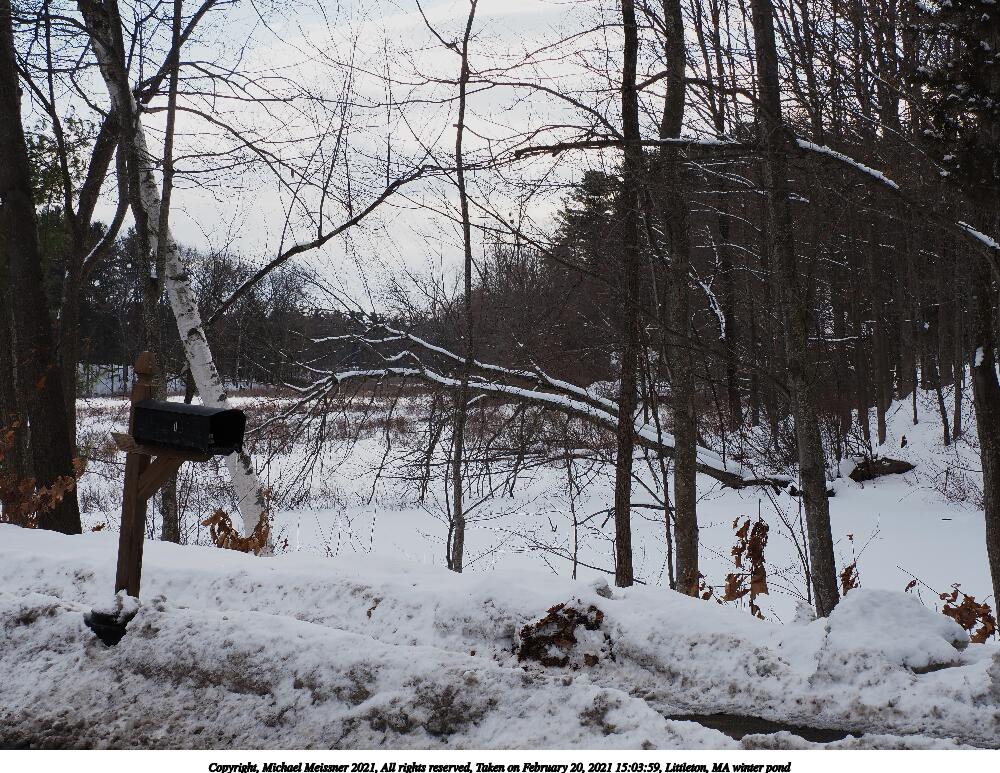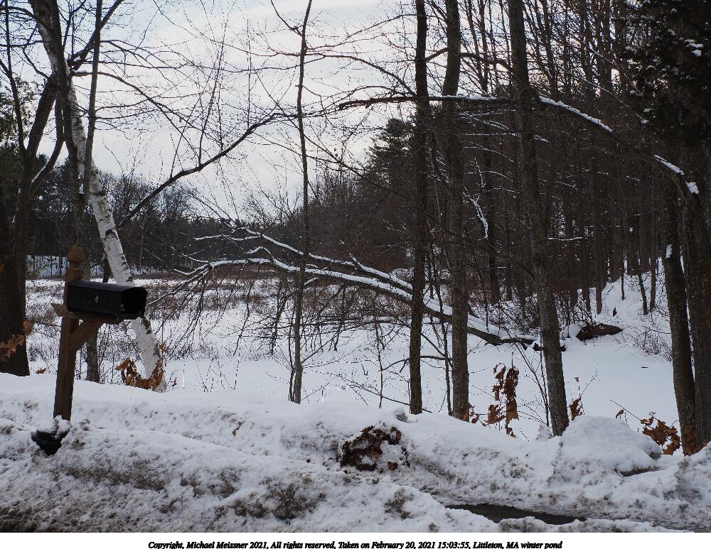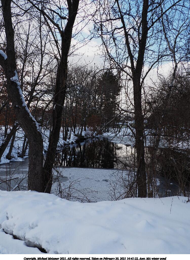 Picture #7: Ayer, MA winter pond #2 750x1023, 277,090 bytes (271K), (html file) Copyright, Michael Meissner 2021, All rights reserved Olympus E-M5-III camera with Olympus-m43 12-200mm f/3.5-6.3 lens f/7.1, ISO 200, 1/250 sec, 12.0mm, auto mode, vivid color, matrix metering, IS Auto 35mm equivalent focal length 24.0mm Programs used: crop, raw therapee, rotate left Taken by Michael Meissner on February 20, 2021 14:41:22 Last modified on February 20, 2021 at 19:26 |