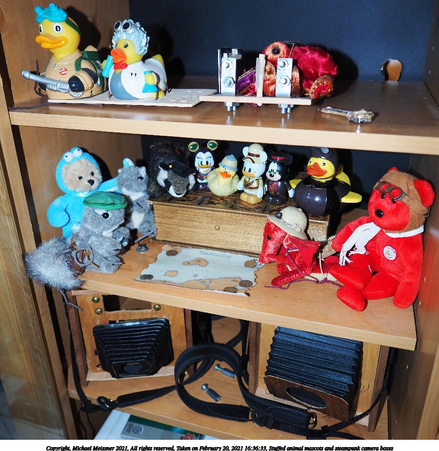 Picture #15: Stuffed animal mascots and steampunk camera boxes 900x923, 183,262 bytes (179K), (html file) Copyright, Michael Meissner 2021, All rights reserved Olympus E-M5-III camera with Olympus-m43 12mm f/2.0 lens f/2.0, ISO 200, flash, 1/60 sec, 12.0mm, auto mode, vivid color, matrix metering, manual focus, IS Auto 35mm equivalent focal length 24.0mm Programs used: crop, gimp, raw therapee, rotate left Taken by Michael Meissner on February 20, 2021 16:36:33 Last modified on February 20, 2021 at 18:17 |