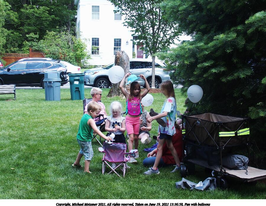 Picture #9: Fun with balloons 900x698, 213,822 bytes (209K), (html file) Copyright, Michael Meissner 2021, All rights reserved Olympus Stylus-1 camera f/3.5, ISO 100, 1/160 sec, 12.0mm, auto mode, natural color, matrix metering, IS Auto, noise reduction auto 35mm equivalent focal length 57.0mm Programs used: crop, raw therapee Taken by Michael Meissner on June 19, 2021 13:36:58 Last modified on June 19, 2021 at 18:55 |