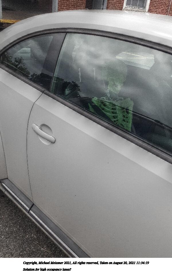 Picture #6: Solution for high occupancy lanes? 600x946, 83,895 bytes (82K), (html file) Copyright, Michael Meissner 2021, All rights reserved Samsung A20 phone f/1.9, ISO 40, 1/1689 sec, 3.6mm, auto mode, spot metering 35mm equivalent focal length 27.0mm Programs used: gimp, rotate Taken by Michael Meissner on August 20, 2021 11:34:19 Last modified on August 20, 2021 at 17:03 |