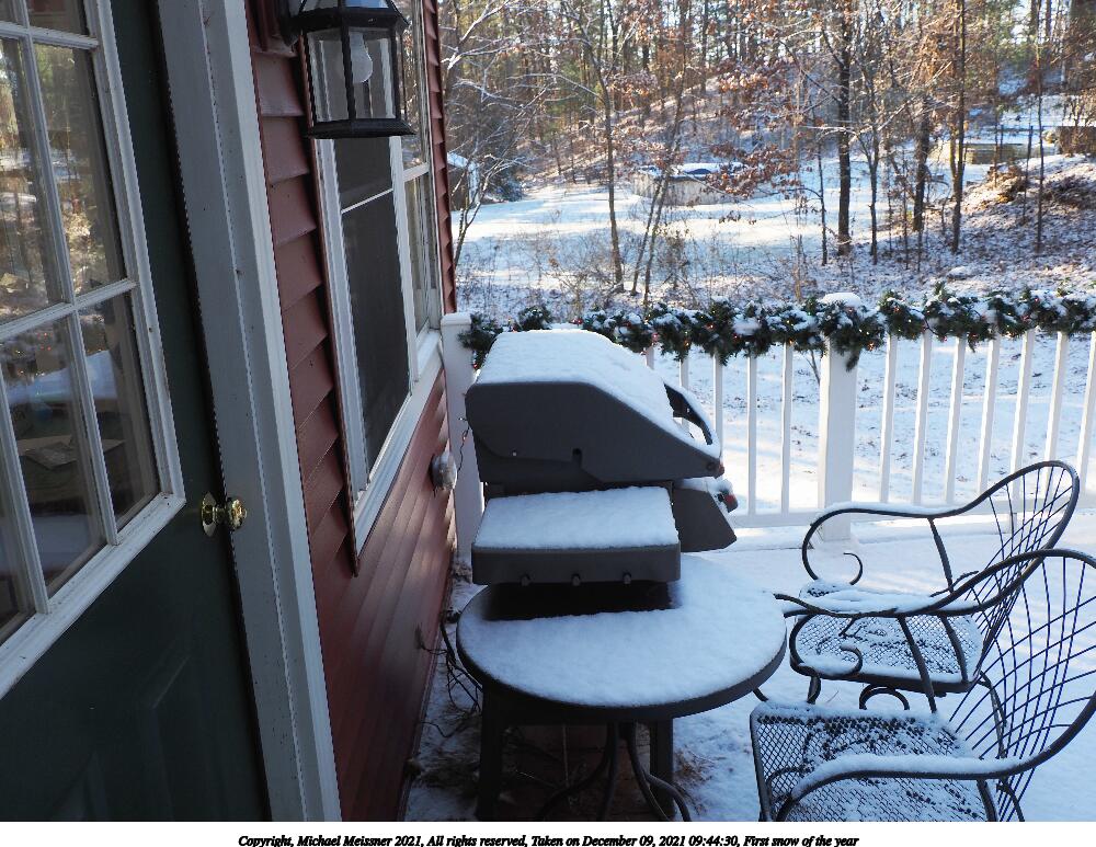 Picture #20: First snow of the year 1000x773, 195,046 bytes (191K), (html file) Copyright, Michael Meissner 2021, All rights reserved Olympus E-M5-III camera with Olympus-m43 12-200mm f/3.5-6.3 lens f/5.6, ISO 200, 1/125 sec, 15.0mm, auto mode, vivid color, matrix metering, bias -0.3, IS Auto 35mm equivalent focal length 30.0mm Programs used: crop, gimp, raw therapee Taken by Michael Meissner on December 09, 2021 09:44:30 Last modified on December 12, 2021 at 15:35 |
