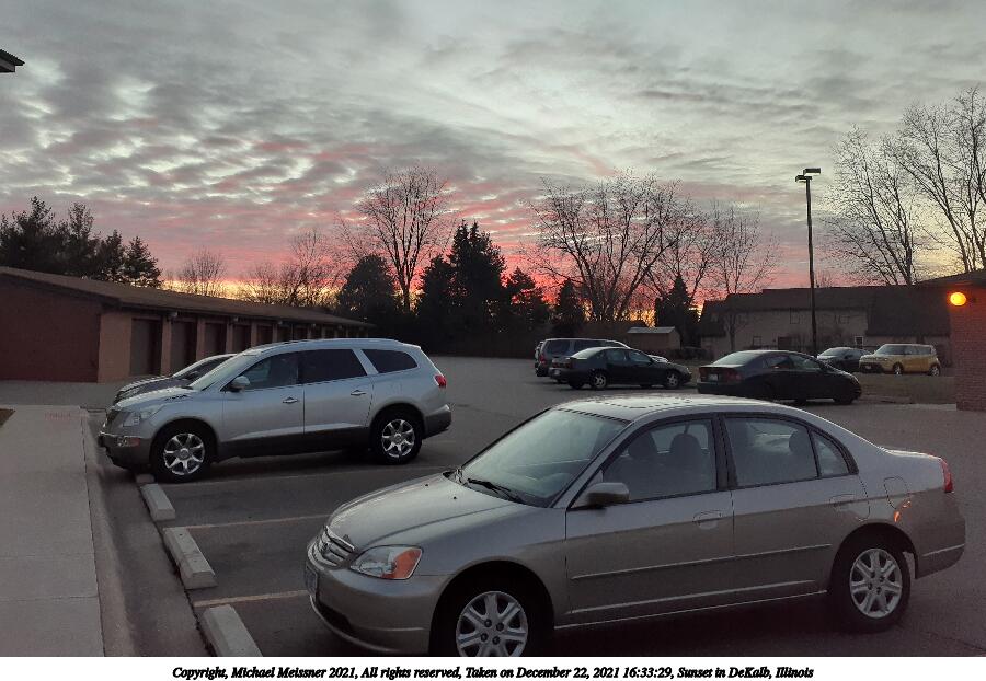 Picture #11: Sunset in DeKalb, Illinois #2 900x622, 66,509 bytes (65K), (html file) Copyright, Michael Meissner 2021, All rights reserved Samsung A20 phone f/1.9, ISO 50, 1/120 sec, 3.6mm, auto mode, spot metering 35mm equivalent focal length 27.0mm Programs used: raw therapee Taken by Michael Meissner on December 22, 2021 16:33:46 Last modified on December 31, 2021 at 23:15 |
