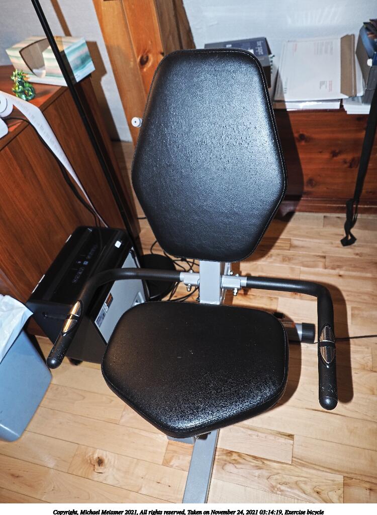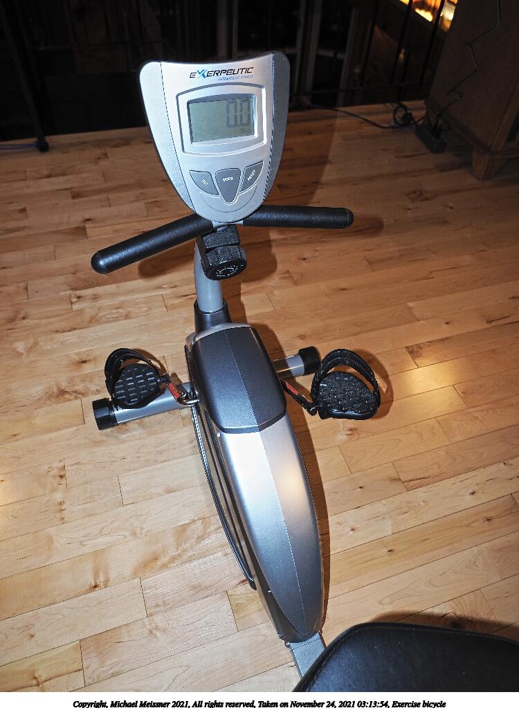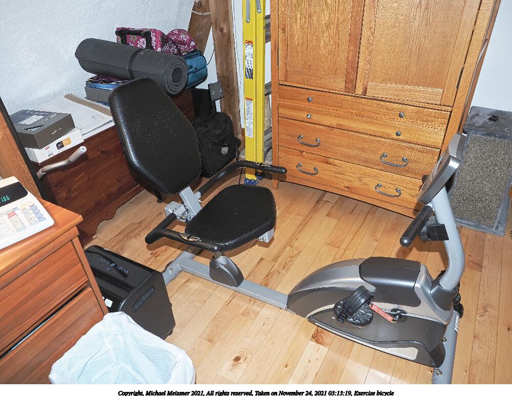 Picture #3: Exercise bicycle #3 750x1023, 130,082 bytes (128K), (html file) Copyright, Michael Meissner 2021, All rights reserved Olympus E-M1-II camera with Olympus-m43 12-40mm f/2.8 lens f/2.8, ISO 200, flash, 1/60 sec, 12.0mm, auto mode, natural color, SHQ, matrix metering, IS Auto, anti-shock 35mm equivalent focal length 24.0mm Programs used: crop, raw therapee, rotate left Taken by Michael Meissner on November 24, 2021 03:13:54 Last modified on November 24, 2021 at 14:27 |