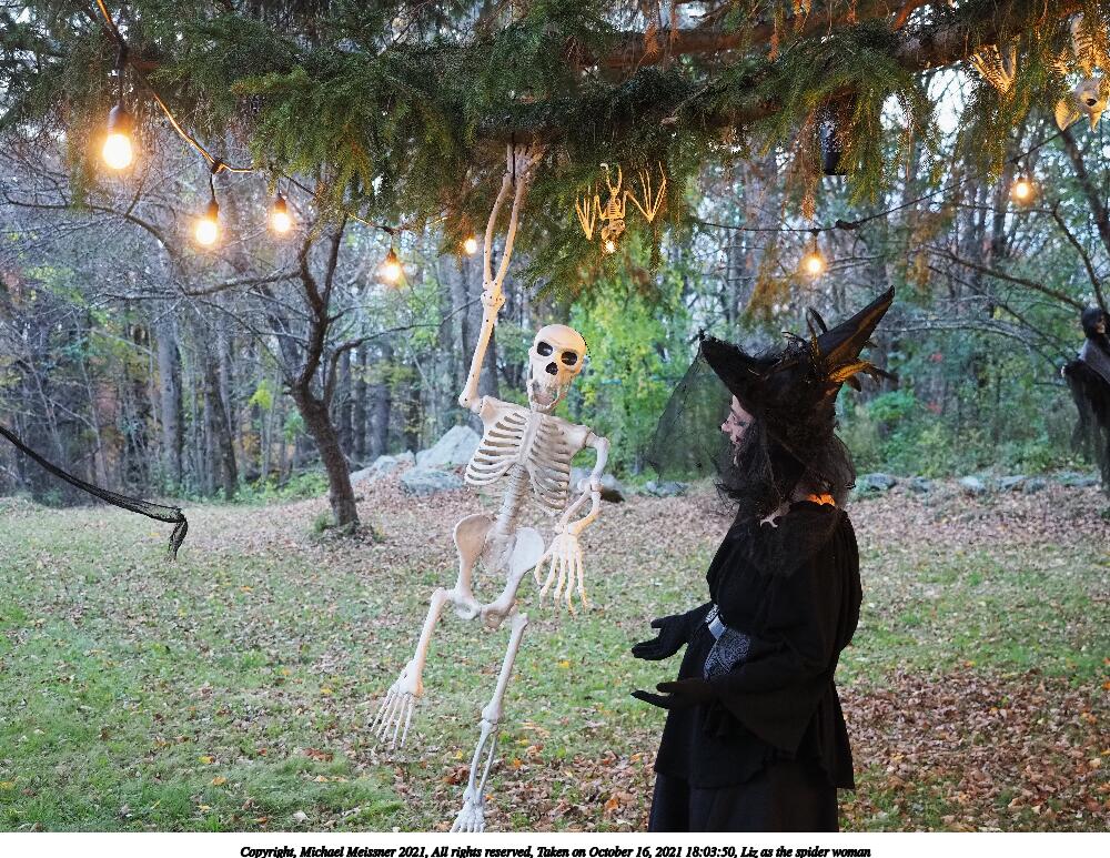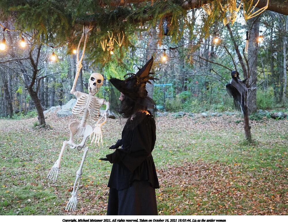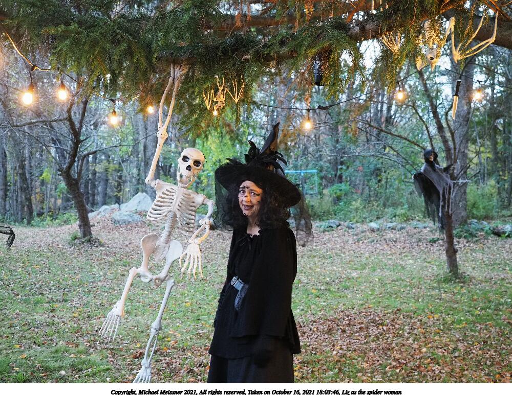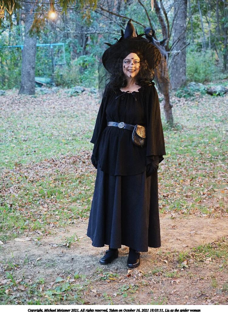 Picture #49: Liz as the spider woman #2 1000x773, 246,178 bytes (241K), (html file) Copyright, Michael Meissner 2021, All rights reserved Olympus E-M1-II camera with Olympus-m43 12-40mm f/2.8 lens f/2.8, ISO 2500, 1/60 sec, 22.0mm, auto mode, natural color, SHQ, matrix metering, IS Auto, both eyes priority, face detection, anti-shock 35mm equivalent focal length 44.0mm Programs used: crop, raw therapee Taken by Michael Meissner on October 16, 2021 18:03:44 Last modified on November 02, 2021 at 01:02 |