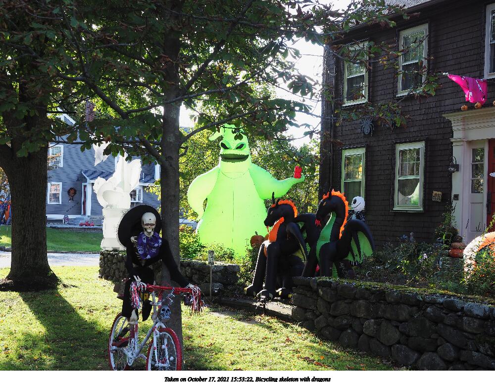 Picture #37: Bicycling skeleton with dragons #2 1000x773, 276,535 bytes (271K), (html file) Copyright, Michael Meissner 2021, All rights reserved Olympus E-M1-II camera with Olympus-m43 12-40mm f/2.8 lens f/4.5, ISO 200, 1/160 sec, 12.0mm, auto mode, natural color, SHQ, matrix metering, IS Auto, anti-shock 35mm equivalent focal length 24.0mm Programs used: crop, raw therapee Taken by Michael Meissner on October 17, 2021 15:52:58 Last modified on November 01, 2021 at 00:06 |