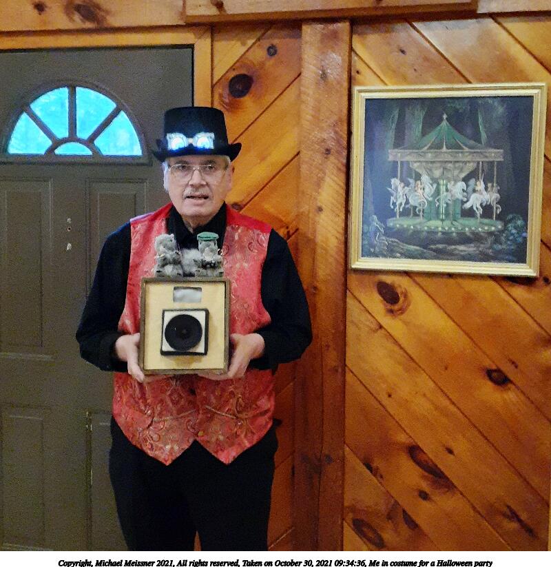 Picture #52: Me in costume for a Halloween party 800x823, 117,806 bytes (116K), (html file) Copyright, Michael Meissner 2021, All rights reserved Samsung A20 phone f/1.9, ISO 800, 1/24 sec, 3.6mm, auto mode, center weight metering 35mm equivalent focal length 27.0mm Programs used: crop, gimp, raw therapee, rotate right Taken by Michael Meissner on October 30, 2021 09:34:36 Last modified on November 02, 2021 at 01:30 |