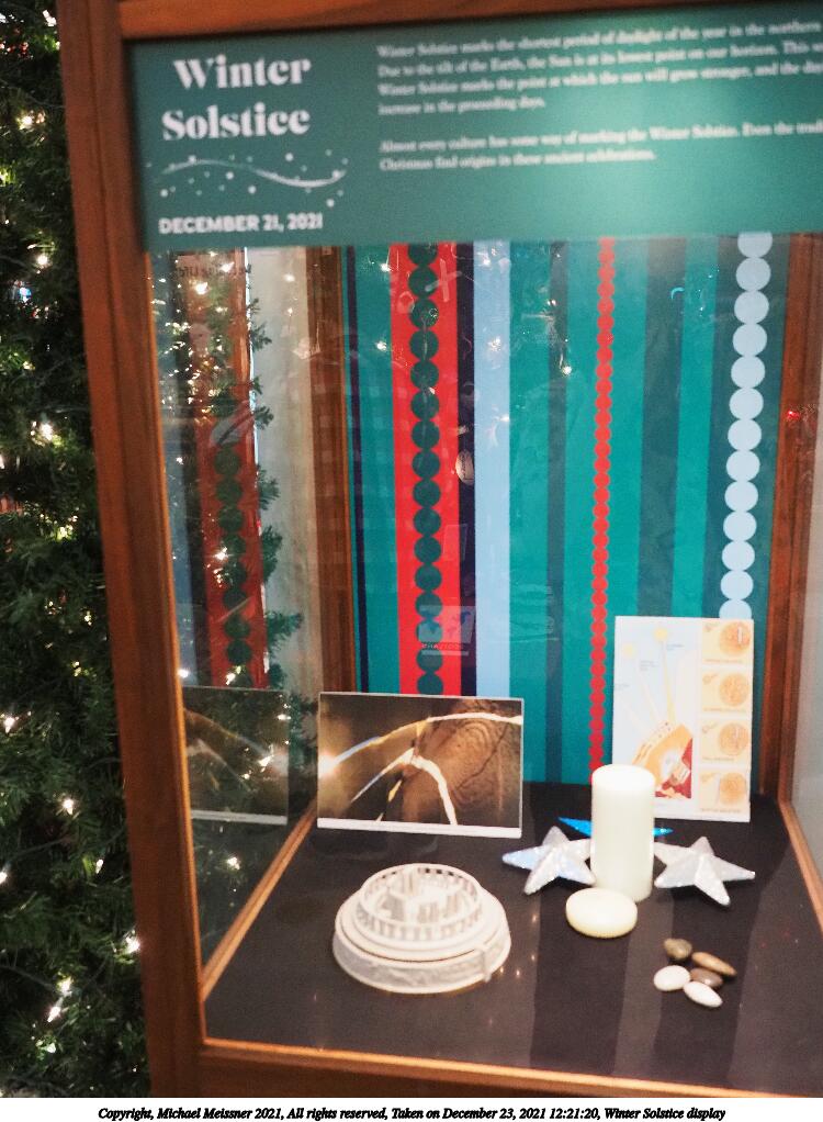 Picture #5: Winter Solstice display Thumb: 375x500, 60,553 bytes (60K) Small: 750x1022, 137,837 bytes (135K), (html file) Copyright, Michael Meissner 2021, All rights reserved Olympus E-M5-III camera with Olympus-m43 12-40mm f/2.8 lens f/2.8, ISO 2500, 1/60 sec, 16.0mm, auto mode, vivid color, matrix metering, IS Auto 35mm equivalent focal length 32.0mm Programs used: crop, raw therapee, rotate left Taken by Michael Meissner on December 23, 2021 12:21:20 Last modified on January 18, 2022 at 00:44 |