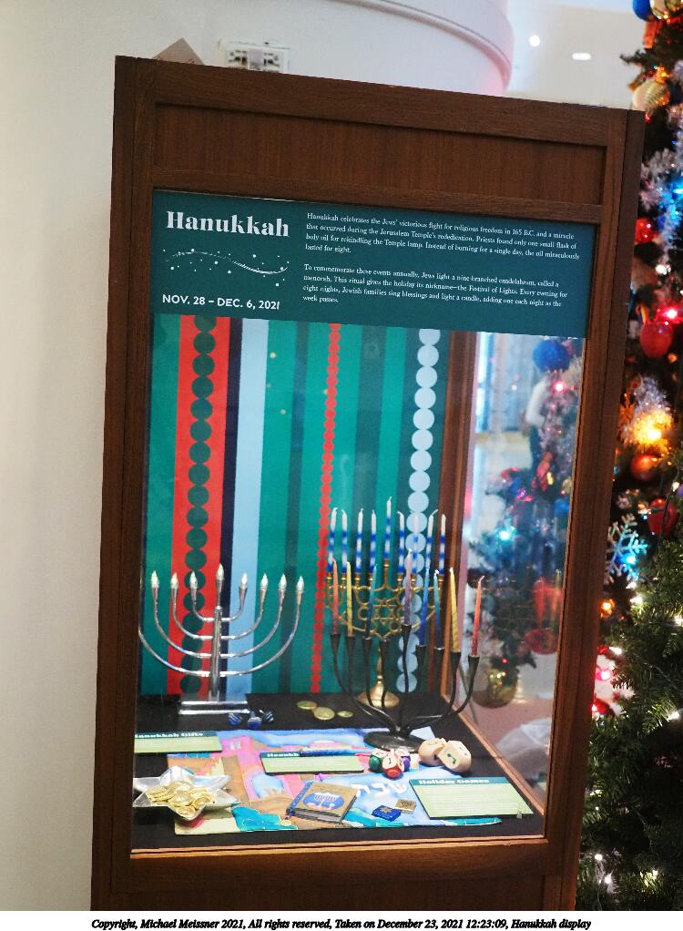 Picture #9: Hanukkah display Thumb: 375x500, 60,500 bytes (60K) Small: 750x1022, 144,771 bytes (142K), (html file) Copyright, Michael Meissner 2021, All rights reserved Olympus E-M5-III camera with Olympus-m43 12-40mm f/2.8 lens f/2.8, ISO 3200, 1/60 sec, 19.0mm, auto mode, vivid color, matrix metering, IS Auto 35mm equivalent focal length 38.0mm Programs used: crop, raw therapee, rotate left Taken by Michael Meissner on December 23, 2021 12:23:09 Last modified on January 18, 2022 at 00:46 |