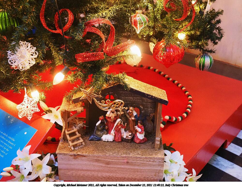 Picture #33: Italy Christmas tree Thumb: 500x375, 76,260 bytes (75K) Small: 1000x772, 230,327 bytes (225K), (html file) Copyright, Michael Meissner 2021, All rights reserved Olympus E-M5-III camera with Olympus-m43 12-40mm f/2.8 lens f/2.8, ISO 3200, 1/60 sec, 20.0mm, auto mode, vivid color, matrix metering, IS Auto, noise reduction auto 35mm equivalent focal length 40.0mm Programs used: crop, raw therapee Taken by Michael Meissner on December 23, 2021 12:40:23 Last modified on January 18, 2022 at 01:03 |
