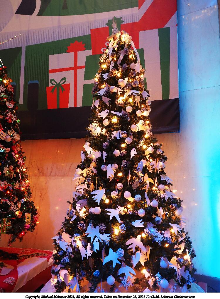 Picture #41: Lebanon Christmas tree Thumb: 375x500, 72,965 bytes (72K) Small: 750x1022, 197,280 bytes (193K), (html file) Copyright, Michael Meissner 2021, All rights reserved Olympus E-M5-III camera with Olympus-m43 12-40mm f/2.8 lens f/2.8, ISO 1000, 1/60 sec, 12.0mm, auto mode, vivid color, matrix metering, IS Auto, noise reduction auto 35mm equivalent focal length 24.0mm Programs used: crop, raw therapee, rotate left Taken by Michael Meissner on December 23, 2021 12:45:36 Last modified on January 18, 2022 at 01:12 |