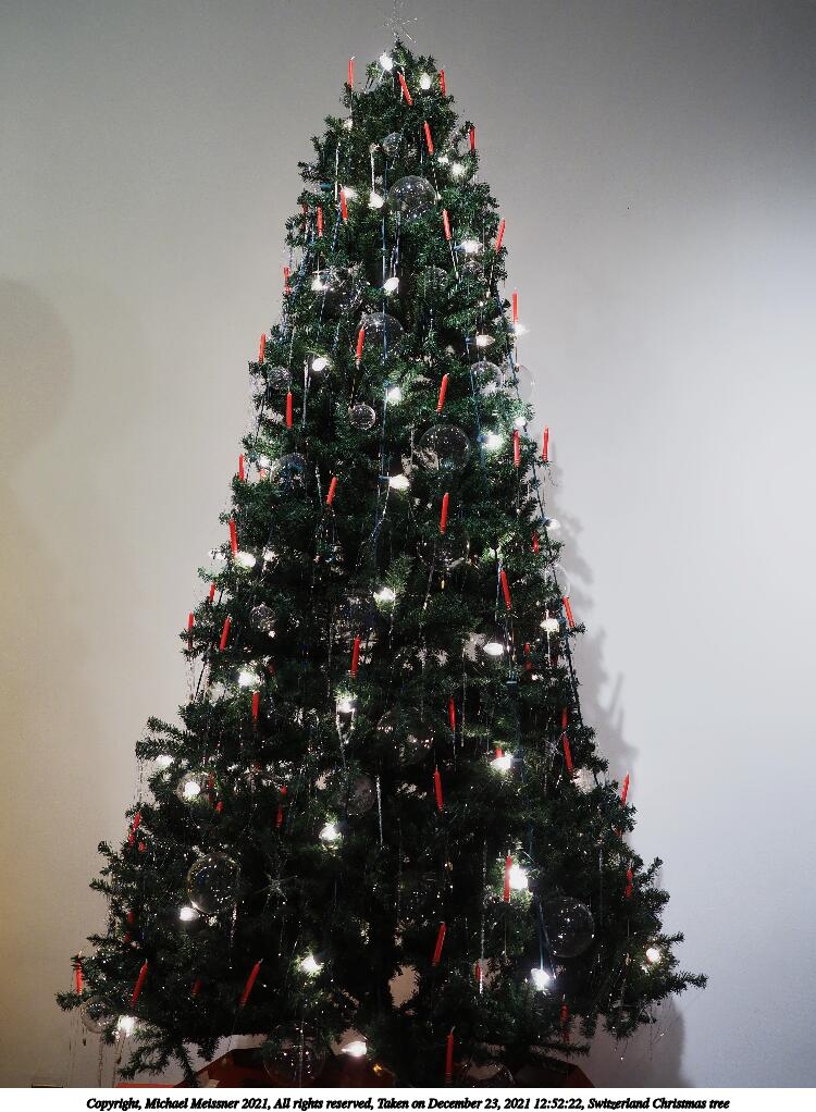 Picture #53: Switzerland Christmas tree Thumb: 375x500, 50,958 bytes (50K) Small: 750x1022, 147,981 bytes (145K), (html file) Copyright, Michael Meissner 2021, All rights reserved Olympus E-M5-III camera with Olympus-m43 12-40mm f/2.8 lens f/2.8, ISO 1000, 1/60 sec, 19.0mm, auto mode, vivid color, matrix metering, IS Auto, noise reduction auto 35mm equivalent focal length 38.0mm Programs used: crop, raw therapee, rotate left Taken by Michael Meissner on December 23, 2021 12:52:22 Last modified on January 18, 2022 at 01:19 |