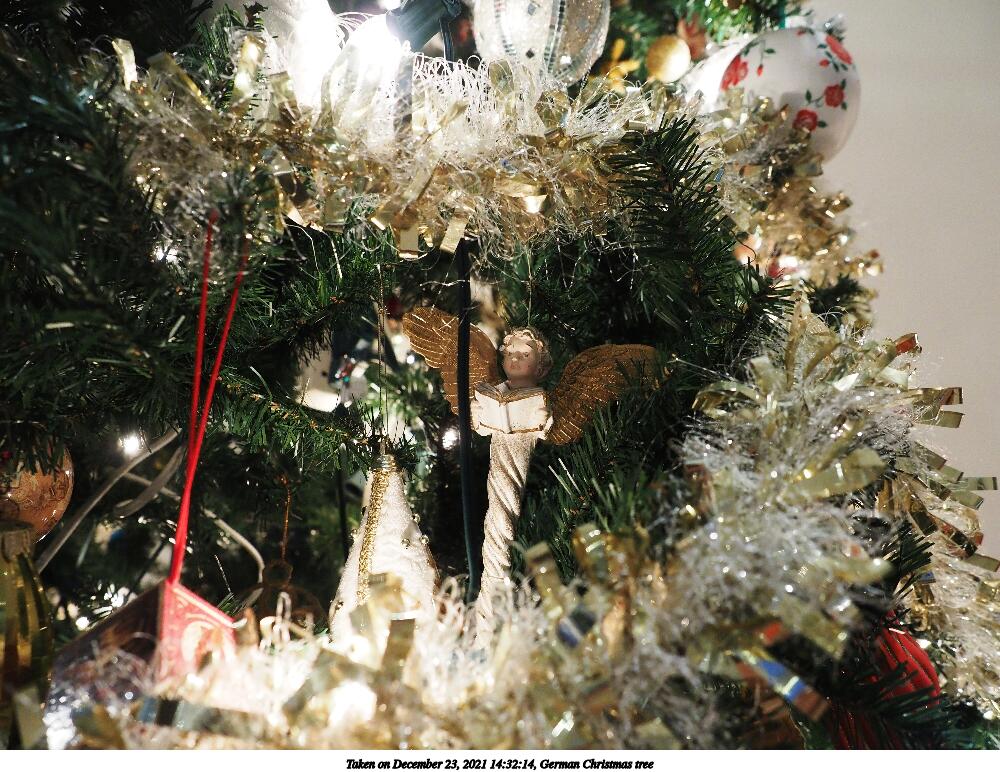 Picture #81: German Christmas tree #5 Thumb: 500x375, 64,583 bytes (64K) Small: 1000x772, 143,035 bytes (140K), (html file) Olympus E-M5-III camera with Olympus-m43 12-40mm f/2.8 lens f/2.8, ISO 1600, 1/60 sec, 28.0mm, auto mode, vivid color, matrix metering, bias -0.3, IS Auto, noise reduction auto 35mm equivalent focal length 56.0mm Programs used: crop, raw therapee Taken by Michael Meissner on December 23, 2021 14:32:30 Last modified on January 20, 2022 at 19:36 |