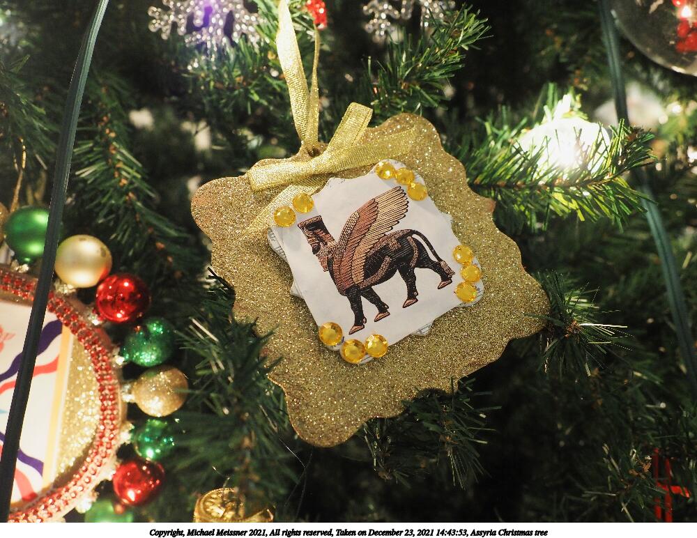 Picture #110: Assyria Christmas tree #3 Thumb: 500x375, 71,604 bytes (70K) Small: 1000x772, 202,382 bytes (198K), (html file) Copyright, Michael Meissner 2021, All rights reserved Olympus E-M5-III camera with Olympus-m43 12-40mm f/2.8 lens f/2.8, ISO 5000, 1/60 sec, 12.0mm, auto mode, vivid color, matrix metering, bias -0.3, IS Auto, noise reduction auto 35mm equivalent focal length 24.0mm Programs used: crop, raw therapee Taken by Michael Meissner on December 23, 2021 14:44:02 Last modified on January 21, 2022 at 00:43 |