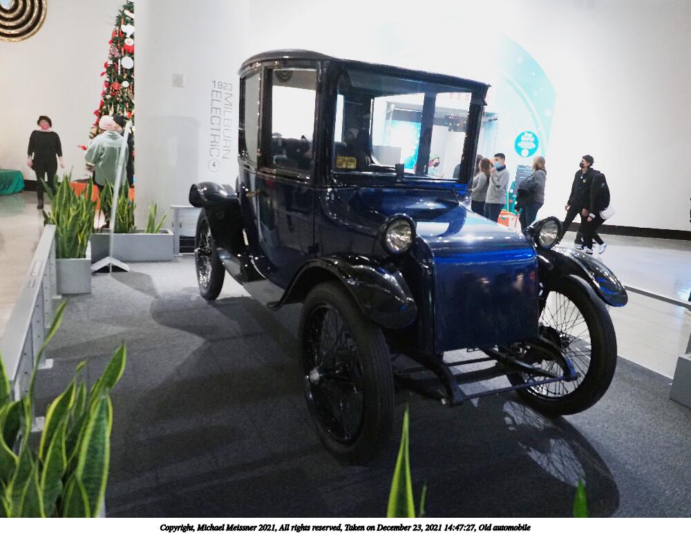 Picture #17: Old automobile Thumb: 500x375, 57,549 bytes (57K) Small: 1000x772, 125,496 bytes (123K), (html file) Copyright, Michael Meissner 2021, All rights reserved Olympus E-M5-III camera with Olympus-m43 12-40mm f/2.8 lens f/2.8, ISO 3200, 1/60 sec, 12.0mm, auto mode, vivid color, matrix metering, bias -0.3, IS Auto, noise reduction auto 35mm equivalent focal length 24.0mm Programs used: crop, gimp, raw therapee Taken by Michael Meissner on December 23, 2021 14:47:27 Last modified on January 21, 2022 at 00:50 |