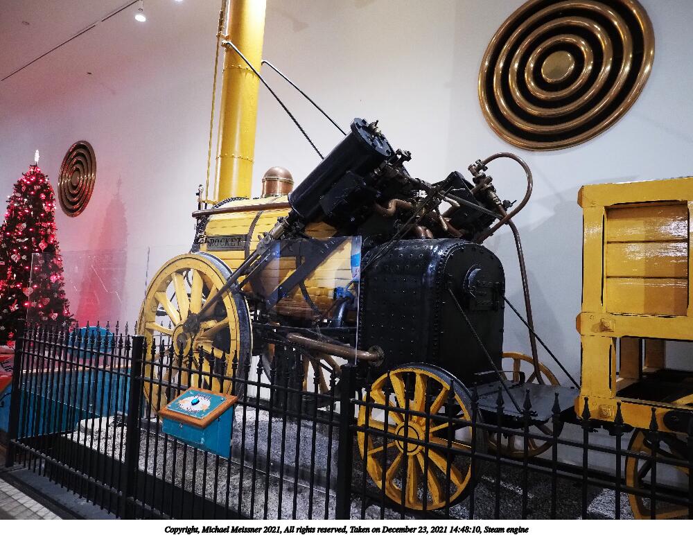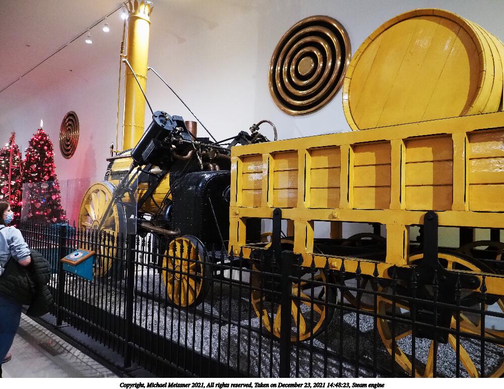 Picture #20: Steam exhibit Thumb: 375x500, 61,983 bytes (61K) Small: 750x1022, 145,835 bytes (143K), (html file) Copyright, Michael Meissner 2021, All rights reserved Olympus E-M5-III camera with Olympus-m43 12-40mm f/2.8 lens f/2.8, ISO 3200, 1/60 sec, 20.0mm, auto mode, vivid color, matrix metering, bias -0.3, IS Auto, noise reduction auto 35mm equivalent focal length 40.0mm Programs used: crop, raw therapee, rotate left Taken by Michael Meissner on December 23, 2021 14:51:55 Last modified on January 21, 2022 at 00:53 |