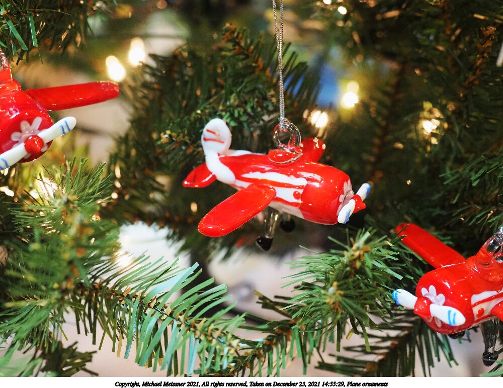 Picture #126: Plane ornaments Thumb: 500x375, 73,046 bytes (72K) Small: 1000x772, 169,234 bytes (166K), (html file) Copyright, Michael Meissner 2021, All rights reserved Olympus E-M5-III camera with Olympus-m43 12-40mm f/2.8 lens f/2.8, ISO 3200, 1/60 sec, 24.0mm, auto mode, vivid color, matrix metering, bias -0.3, IS Auto, noise reduction auto 35mm equivalent focal length 48.0mm Programs used: crop, raw therapee Taken by Michael Meissner on December 23, 2021 14:55:29 Last modified on January 21, 2022 at 00:56 |