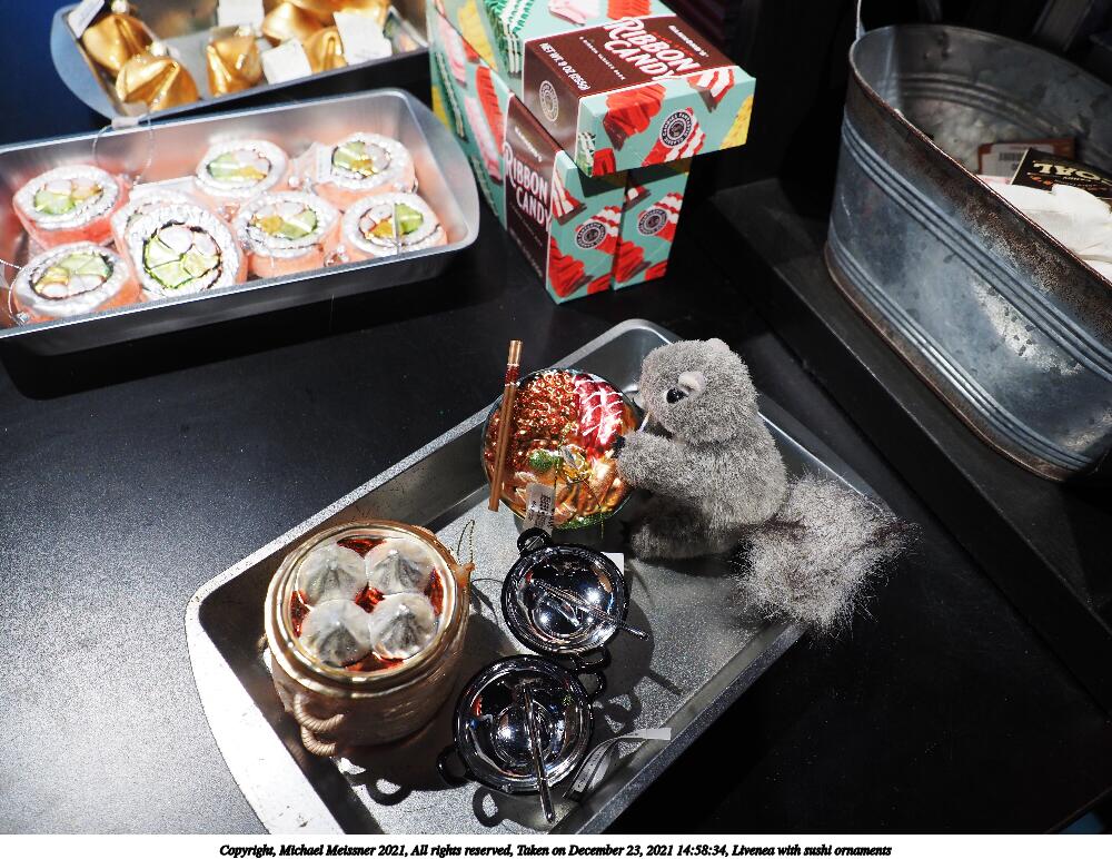 Picture #4: Livenea with sushi ornaments Thumb: 500x375, 64,671 bytes (64K) Small: 1000x772, 184,027 bytes (180K), (html file) Copyright, Michael Meissner 2021, All rights reserved Olympus E-M5-III camera with Olympus-m43 12-40mm f/2.8 lens f/2.8, ISO 400, 1/60 sec, 12.0mm, auto mode, vivid color, matrix metering, bias -0.3, IS Auto, noise reduction auto 35mm equivalent focal length 24.0mm Programs used: crop, raw therapee Taken by Michael Meissner on December 23, 2021 14:58:34 Last modified on January 21, 2022 at 01:01 |