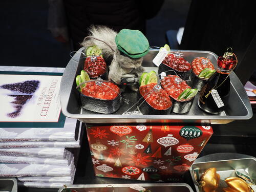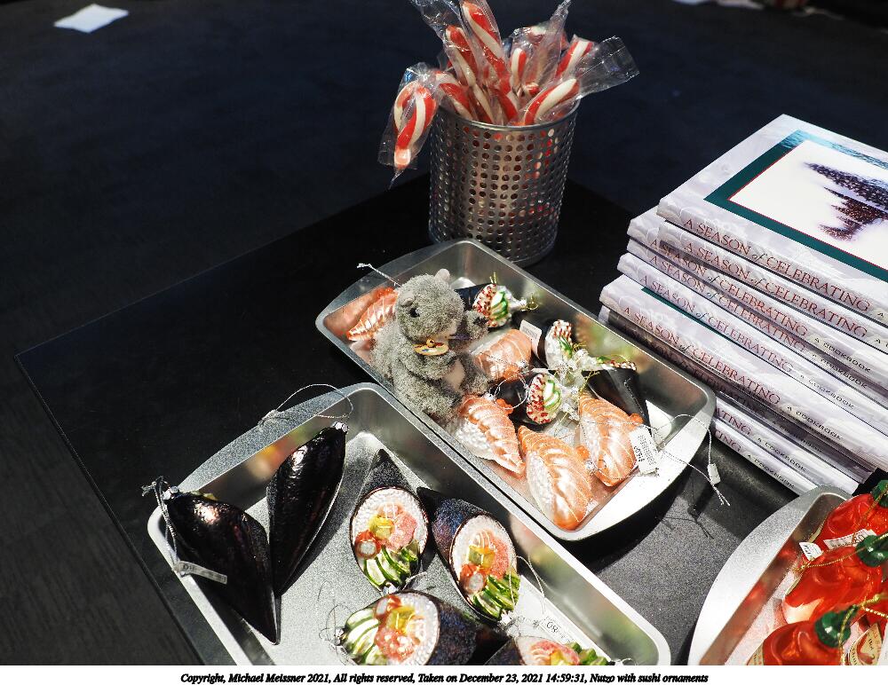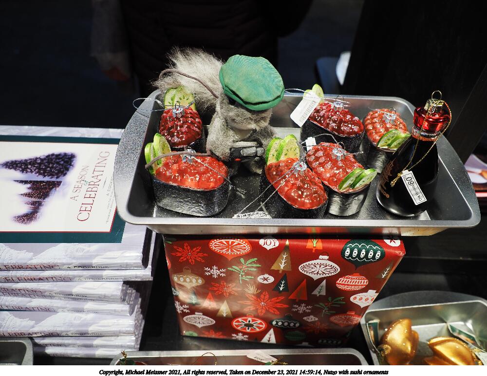 Picture #7: Nutzo with sushi ornaments #2 Thumb: 500x375, 64,386 bytes (63K) Small: 1000x772, 177,286 bytes (174K), (html file) Copyright, Michael Meissner 2021, All rights reserved Olympus E-M5-III camera with Olympus-m43 12-40mm f/2.8 lens f/2.8, ISO 500, 1/60 sec, 12.0mm, auto mode, vivid color, matrix metering, bias -0.3, IS Auto, noise reduction auto 35mm equivalent focal length 24.0mm Programs used: crop, raw therapee Taken by Michael Meissner on December 23, 2021 14:59:31 Last modified on January 21, 2022 at 01:03 |