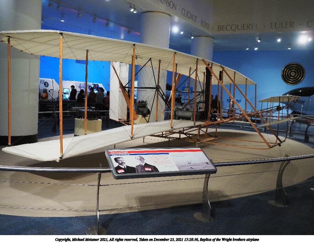 Picture #21: Replica of the Wright brothers airplane Thumb: 500x375, 57,277 bytes (56K) Small: 1000x772, 153,403 bytes (150K), (html file) Copyright, Michael Meissner 2021, All rights reserved Olympus E-M5-III camera with Olympus-m43 12-40mm f/2.8 lens f/2.8, ISO 1600, 1/60 sec, 17.0mm, auto mode, vivid color, matrix metering, bias -0.3, IS Auto, noise reduction auto 35mm equivalent focal length 34.0mm Programs used: crop, raw therapee Taken by Michael Meissner on December 23, 2021 15:28:36 Last modified on January 21, 2022 at 01:11 |