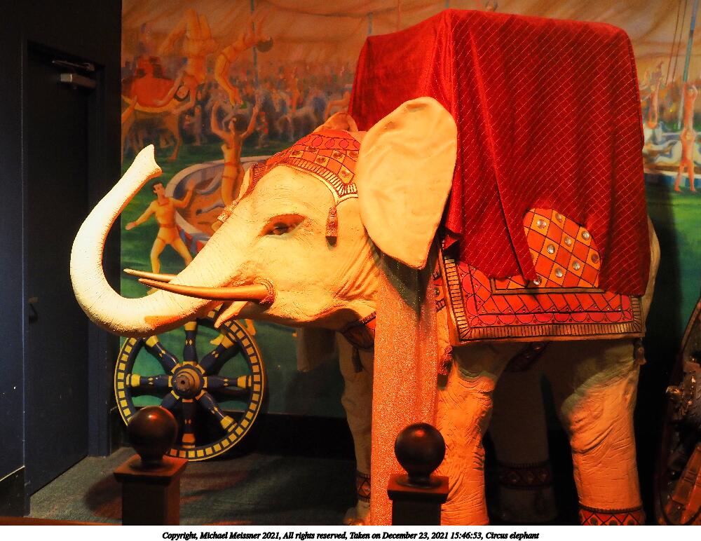 Picture #32: Circus elephant Thumb: 500x375, 61,229 bytes (60K) Small: 1000x772, 157,302 bytes (154K), (html file) Copyright, Michael Meissner 2021, All rights reserved Olympus E-M5-III camera with Olympus-m43 12-40mm f/2.8 lens f/3.2, ISO 1600, 1/60 sec, 22.0mm, auto mode, vivid color, matrix metering, bias -0.3, IS Auto, noise reduction auto 35mm equivalent focal length 44.0mm Programs used: crop, raw therapee Taken by Michael Meissner on December 23, 2021 15:46:53 Last modified on January 21, 2022 at 01:22 |