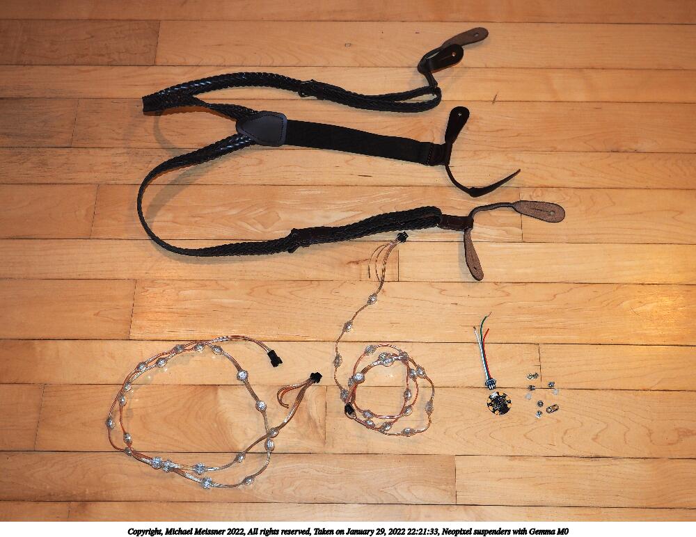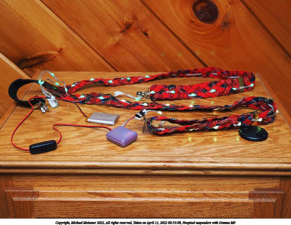 Picture #6: Neopixel suspenders with Gemma M0 #3 Small: 1000x772, 178,350 bytes (175K), (html file) Large: 5000x3750, 5,014,310 bytes (4.8M), (html file) Copyright, Michael Meissner 2022, All rights reserved Olympus E-M5-III camera with Olympus-m43 12-40mm f/2.8 lens f/8.0, ISO 640, flash, 1/60 sec, 23.0mm, aperture priority, vivid color, matrix metering, bias -0.3, IS Auto, noise reduction auto 35mm equivalent focal length 46.0mm Programs used: crop, raw therapee Taken by Michael Meissner on April 11, 2022 00:52:44 Last modified on May 23, 2022 at 21:13 |