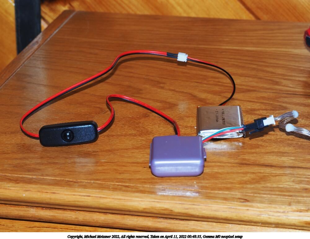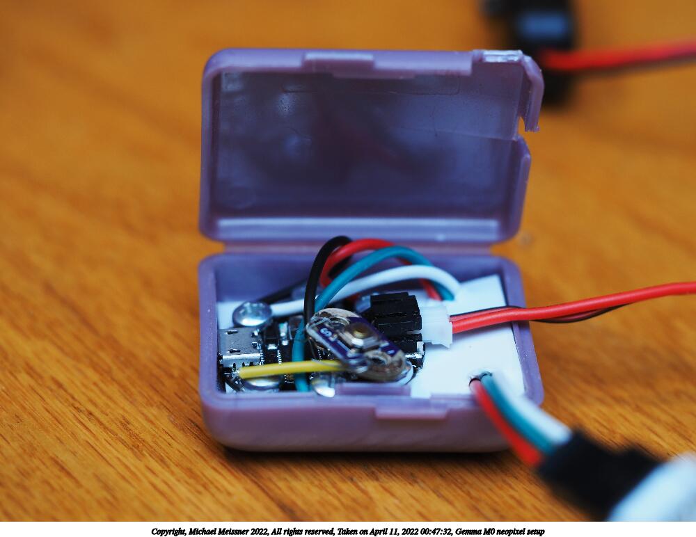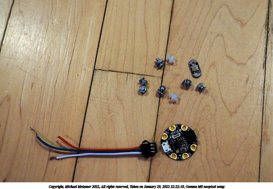 Picture #3: Gemma M0 neopixel setup Small: 900x622, 117,363 bytes (115K), (html file) Large: 3600x2400, 7,034,553 bytes (6.7M), (html file) Copyright, Michael Meissner 2022, All rights reserved Olympus E-M5-III camera with Olympus-m43 12-40mm f/2.8 lens f/2.8, ISO 640, 1/60 sec, 18.0mm, auto mode, vivid color, matrix metering, bias -0.3, IS Auto, noise reduction auto, both eyes priority, face detection 35mm equivalent focal length 36.0mm Programs used: crop, gimp, raw therapee Taken by Michael Meissner on January 29, 2022 22:22:10 Last modified on May 23, 2022 at 21:09 |