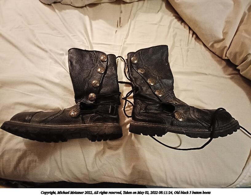Picture #3: Old black 5 button boots Small: 816x634, 83,611 bytes (82K), (html file) Large: 3264x2448, 1,350,917 bytes (1.3M), (html file) Copyright, Michael Meissner 2022, All rights reserved Samsung A32 5G phone f/2.2, ISO 640, 1/15 sec, 1.4mm, Not Defined, center weight metering Programs used: raw therapee, rotate left Taken by Michael Meissner on May 02, 2022 08:11:24 Last modified on May 02, 2022 at 10:06 |