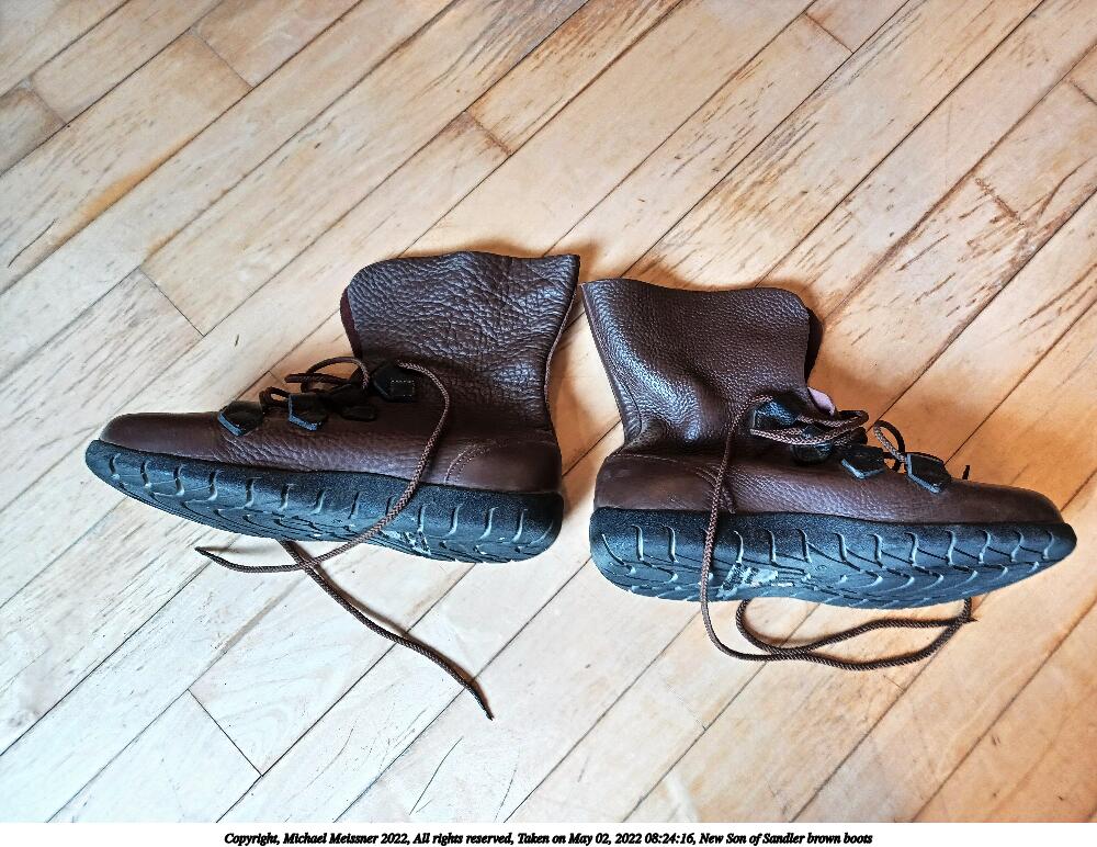 Picture #5: New Son of Sandler brown boots Small: 1000x772, 160,001 bytes (157K), (html file) Large: 4000x3000, 3,043,846 bytes (2.9M), (html file) Copyright, Michael Meissner 2022, All rights reserved Samsung A32 5G phone f/1.8, ISO 320, 1/24 sec, 4.6mm, auto mode, spot metering 35mm equivalent focal length 25.0mm Programs used: raw therapee Taken by Michael Meissner on May 02, 2022 08:24:16 Last modified on May 02, 2022 at 10:07 |